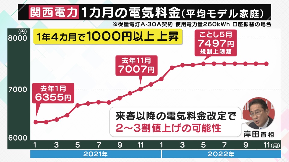 関西電力によると、平均的な使用量の家庭の1カ月の電気料金は、この1年4カ月で1000円以上も上昇しています。2021年1月には6355円だったものが、11月には7007円に、2022年5月には「規制上限額」の7497円に達し、その後は横ばいとなっています。