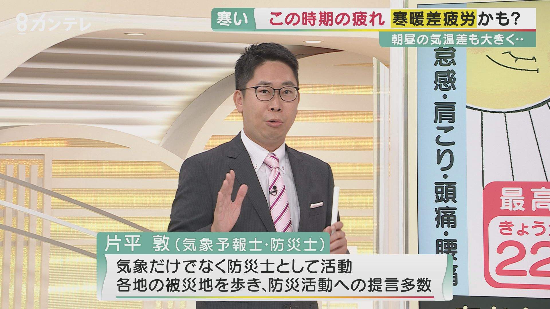 この時期に疑われる「寒暖差疲労」の症状と対処法を、片平気象予報士と一緒に見ていきます。