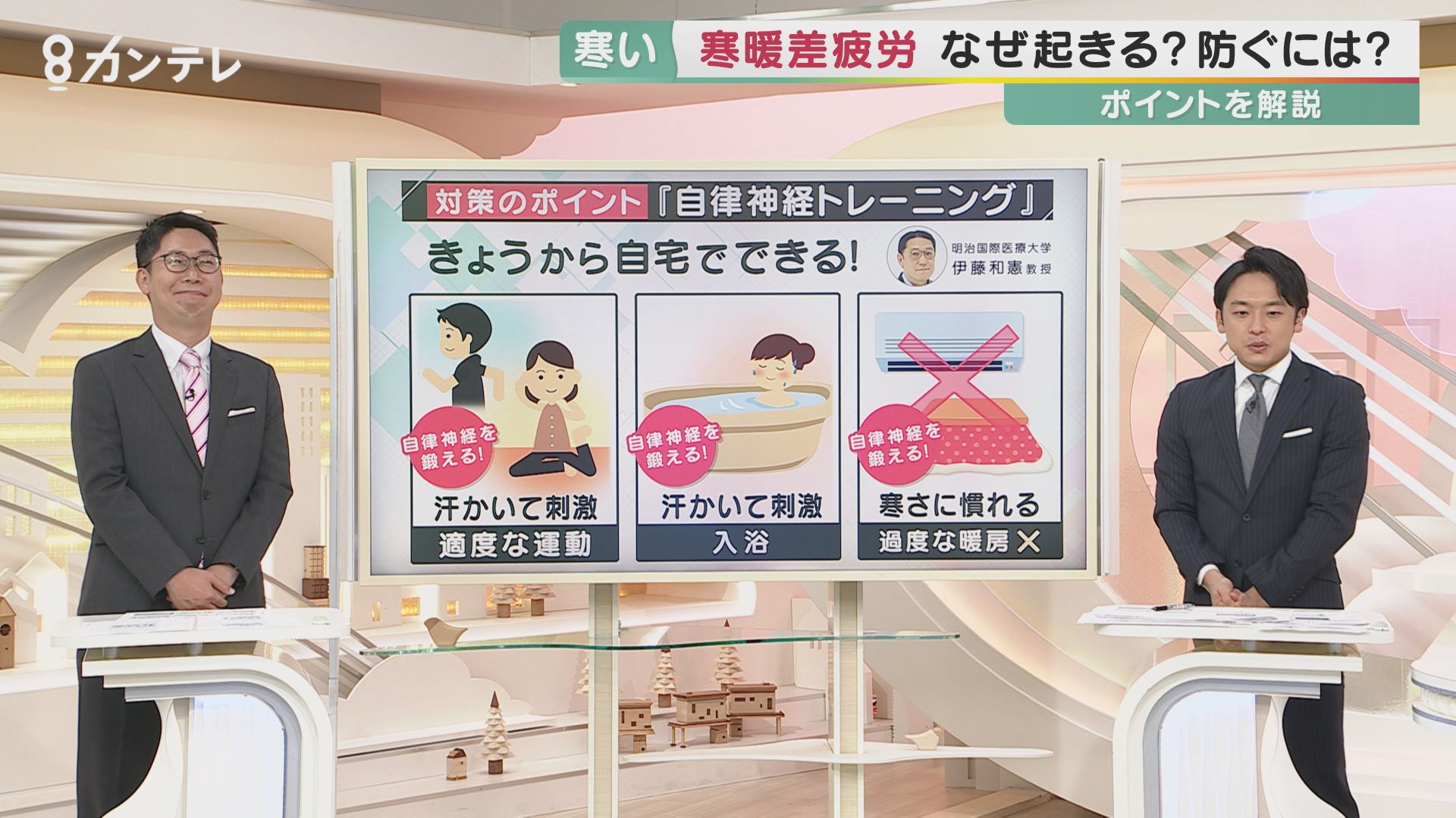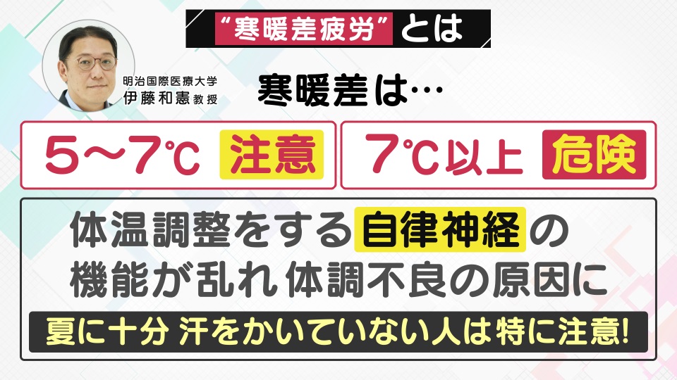 「寒暖差疲労」に詳しい明治国際医療大学の伊藤和憲教授は、「5~7度の寒暖差は注意」、「7度以上の寒暖差は危険」だと言います。