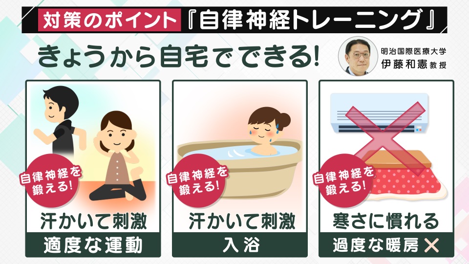 では、自律神経は過剰に働かせないためにはどうすればいいのでしょうか。伊藤教授は「自律神経を鍛えるトレーニングが重要」だと言います。今日から自宅でできる「自律神経トレーニング」を、3つ教えてもらいました。