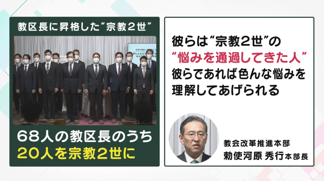 旧統一教会は宗教2世の苦しみの救済措置として、“宗教2世”を教区長に昇格させたとし、会見にも登壇させました。68人の教区長のうち、20人を宗教2世にしたということです。勅使河原本部長は、「彼らは“宗教2世”の“悩みを通過してきた人”。彼らであれば2世の悩みを理解してあげられる」と話しています。