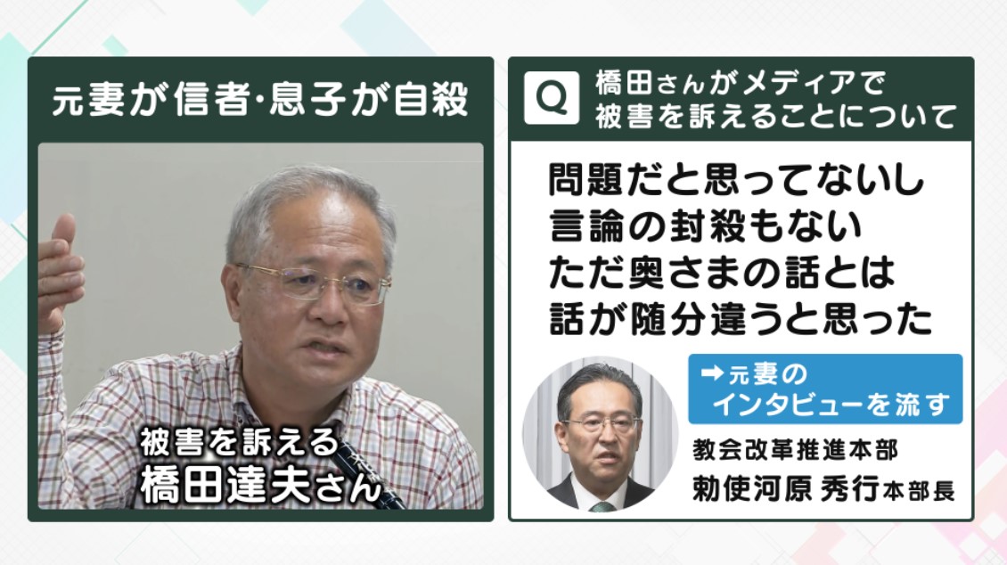 会見では、元妻が旧統一教会の信者で、長男が自ら命を絶った橋田さんがメディアで被害を訴えることについても質問が集中しました。勅使河原本部長は「問題だと思っていないし、言論の封殺もない。ただ、奥さまの話とは話がずいぶん違うと思った」と話し、元妻のインタビューを会見場で流しました。