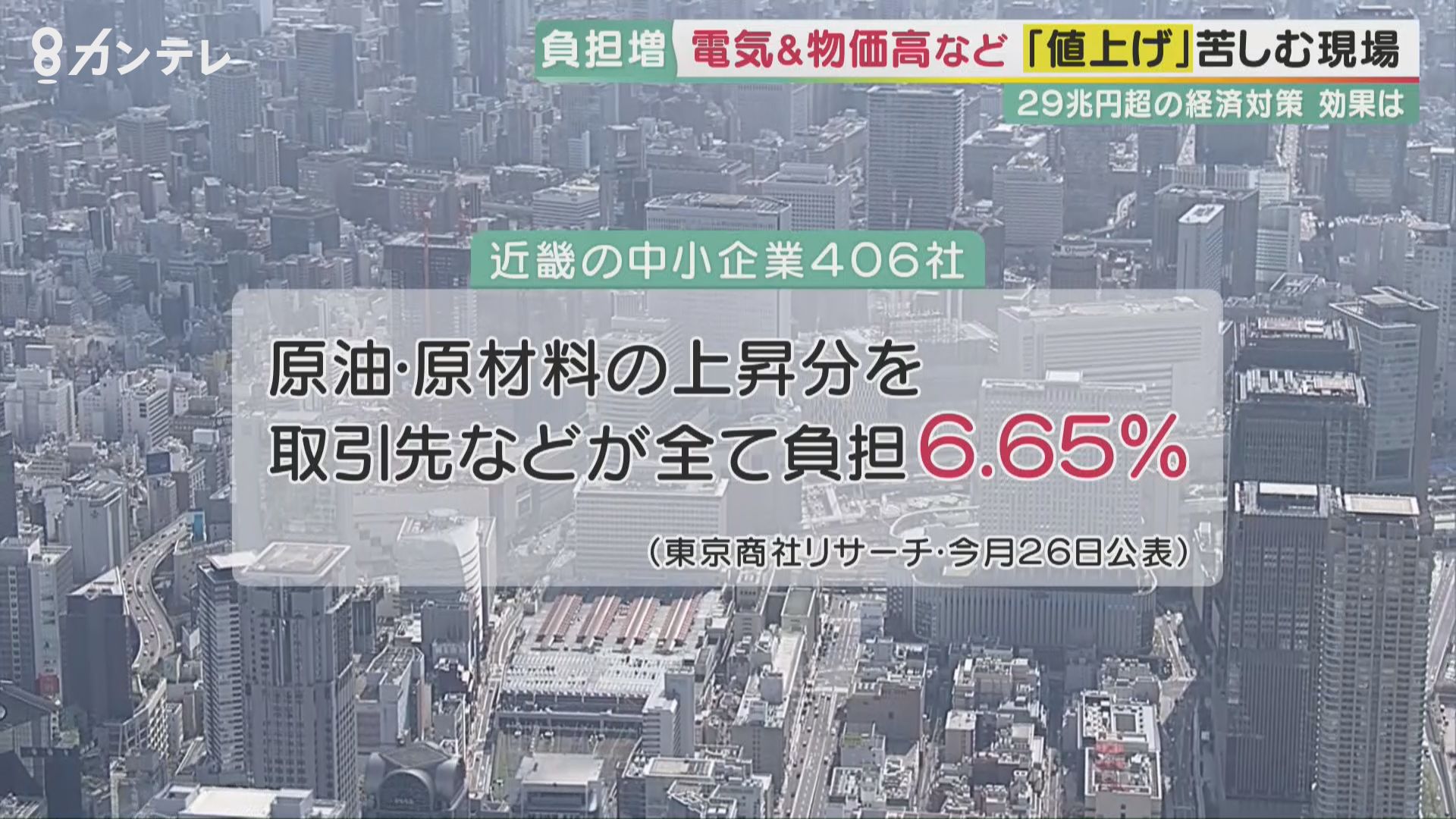 東京商工リサーチによると近畿の中小企業406社のうち、原油・原材料の価格上昇分を取引先などに全て負担してもらえたのは、わずか6.65%にとどまっていました。