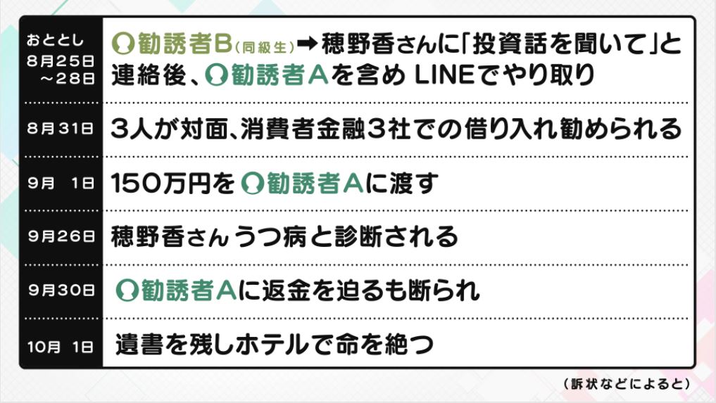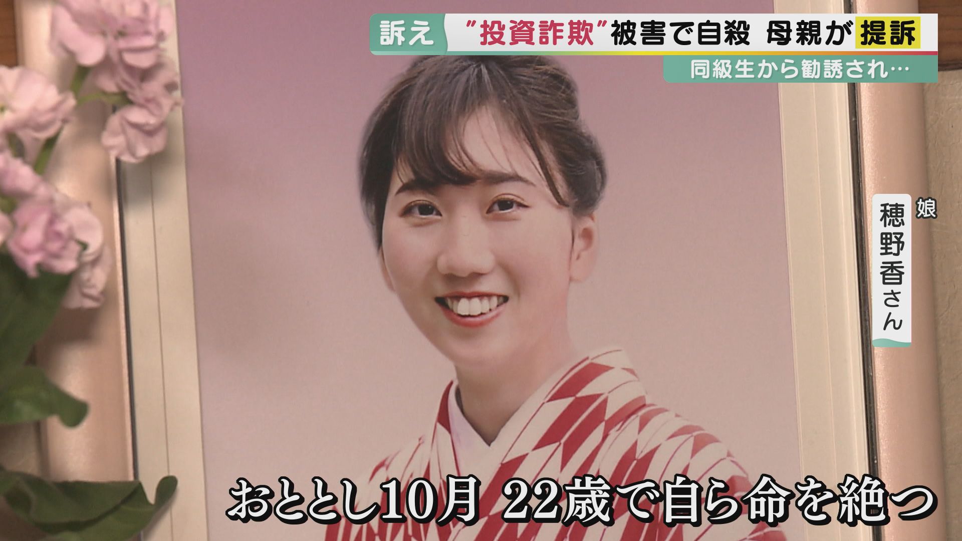 同級生らから勧誘された投資話を巡って、被害に悩んで自ら命を絶った女性の遺族が、同級生らを相手取って損害賠償を求める訴えを起こしました。1人の女性が追い詰められた、被害の実態を取材しました。