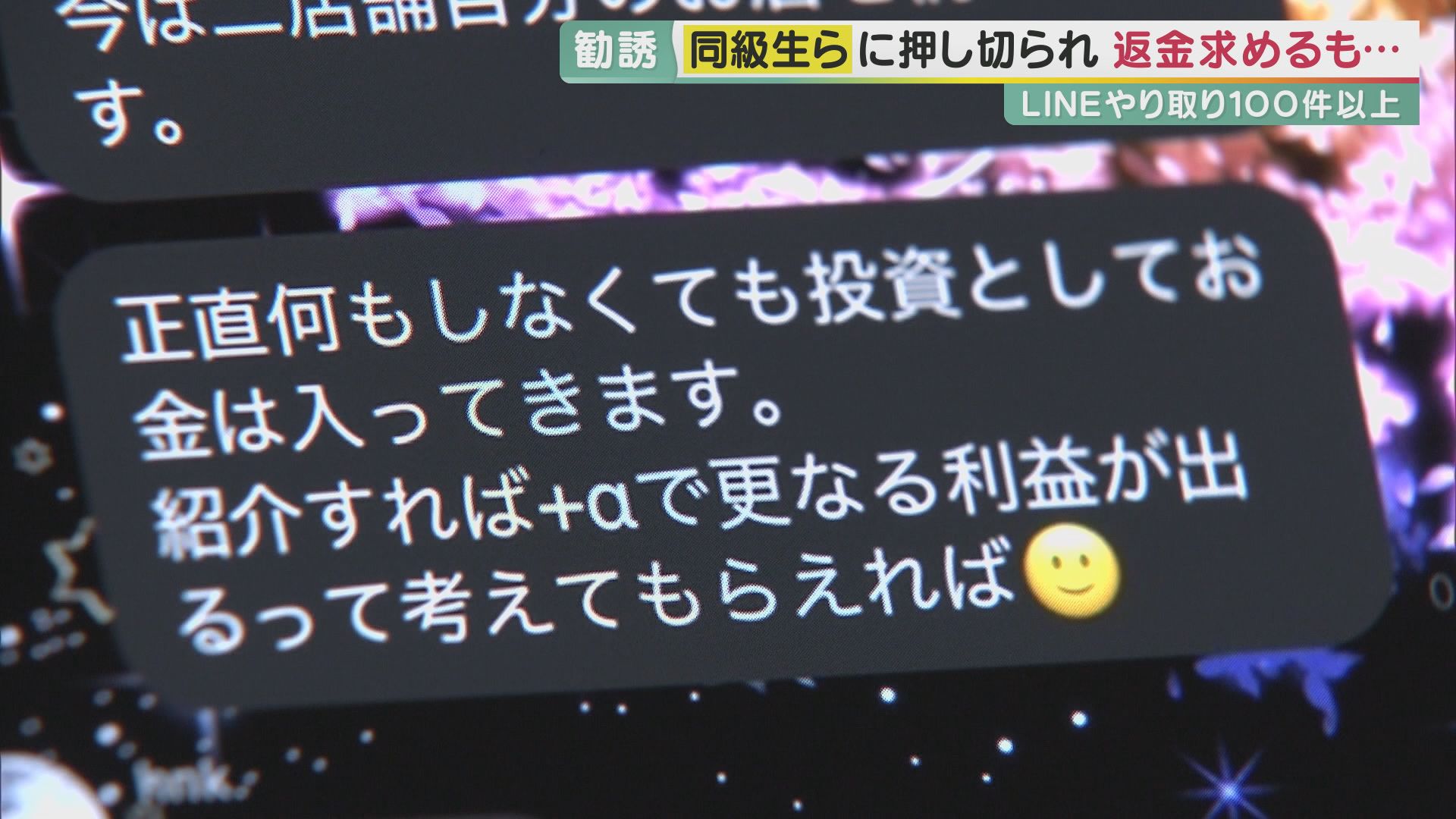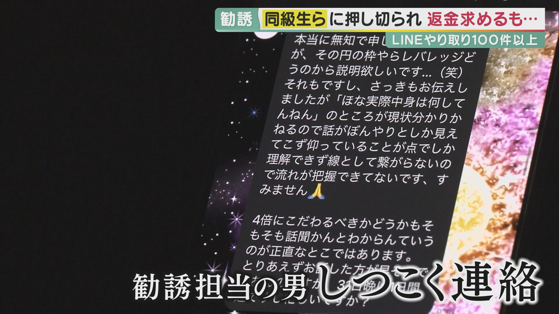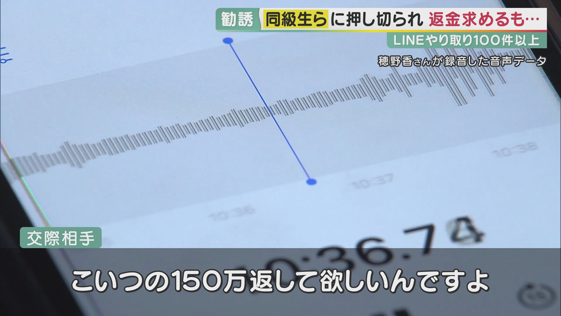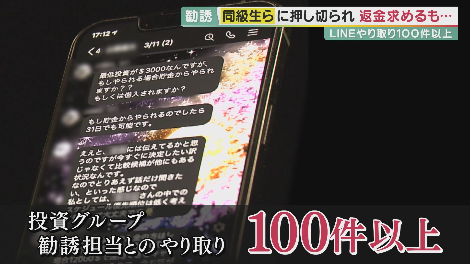 穂野香さんを最初に勧誘したのは、大学の同級生。穂野香さんのスマホには、同級生とそこから紹介された投資グループの勧誘担当の男とのやり取りが、100件以上残されていました。