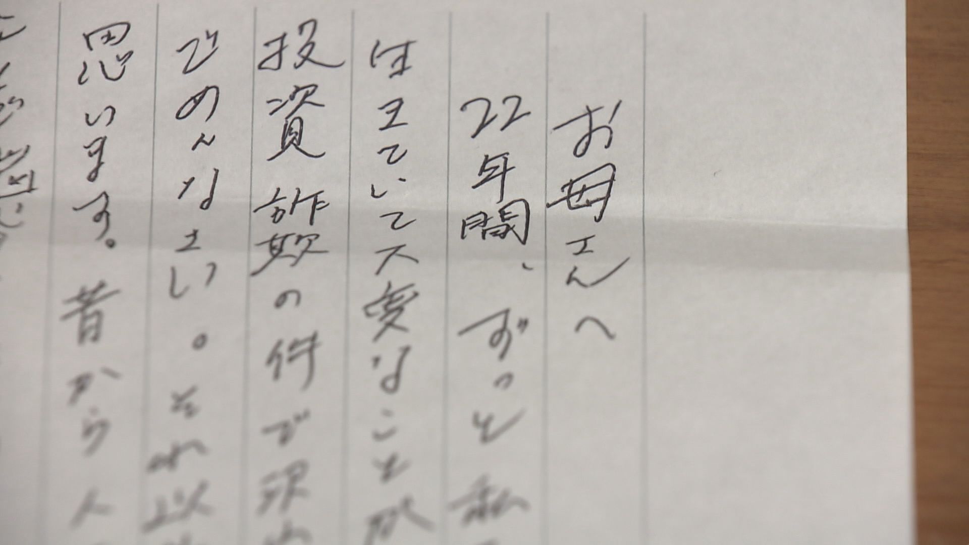 「お母さんへ 22年間、ずっと私を育ててくれてありがとう。投資詐欺の件でたくさん迷惑をかけて心配をかけて本当にごめんなさい。もう十分、迷惑をかけきったと思います。ごめんなさい、本当にありがとう」