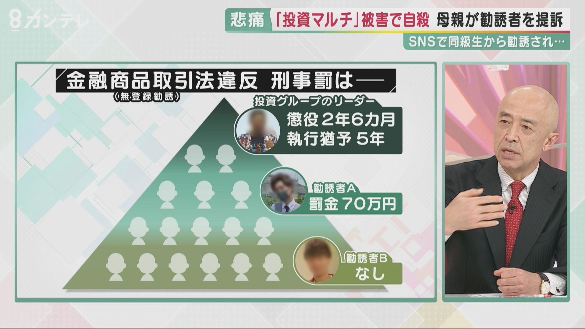 「金融商品取引法というのは、投資などを規制する法律なんです。そこで問題となっているのは、『無資格でやった』ということ。不特定多数に金融商品を紹介するには登録が必要なんです。形式的な違反で、『だましてお金を取った』というところではないんです。おそらく勧誘トークの中で、高利率やあり得ないようないい条件をうたっていて、スマホにも記録が残っていると思うんです。詐欺で立件する余地は十分にあったんじゃないかと思うんですけど…。いずれにしても、できるかどうかは分かりませんが、例えば消費者金融で借り入れた分を、自己破産で清算するという可能性は残されていますから。誰かに相談していただけていれば…と思います」