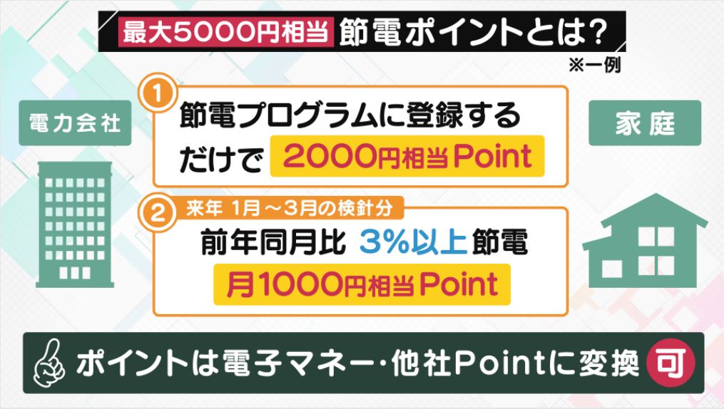 さらに、来年1月~3月にチェックされる電気使用量が、前年同月比で3パーセント以上節電されていれば、月1000円相当のポイントがもらえるということです。