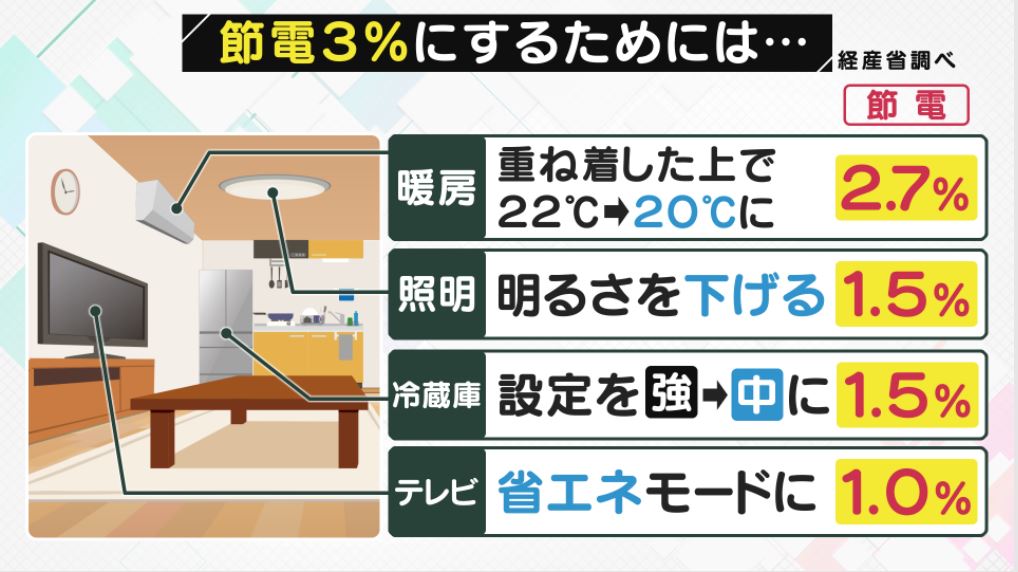 暖房は、重ね着して設定温度を22度から20度に下げると、2.7パーセントの節電になります。照明は明るさを下げれば1.5パーセント、冷蔵庫は設定を強から中にすることで、こちらも1.5パーセントの節電になります。テレビは、省エネモードにすれば1パーセントの節電になるそうです。