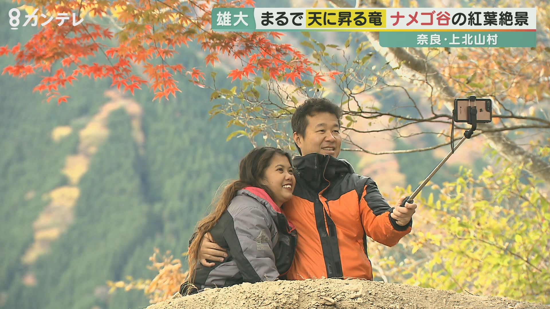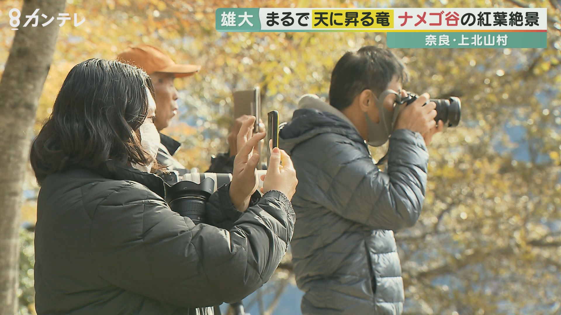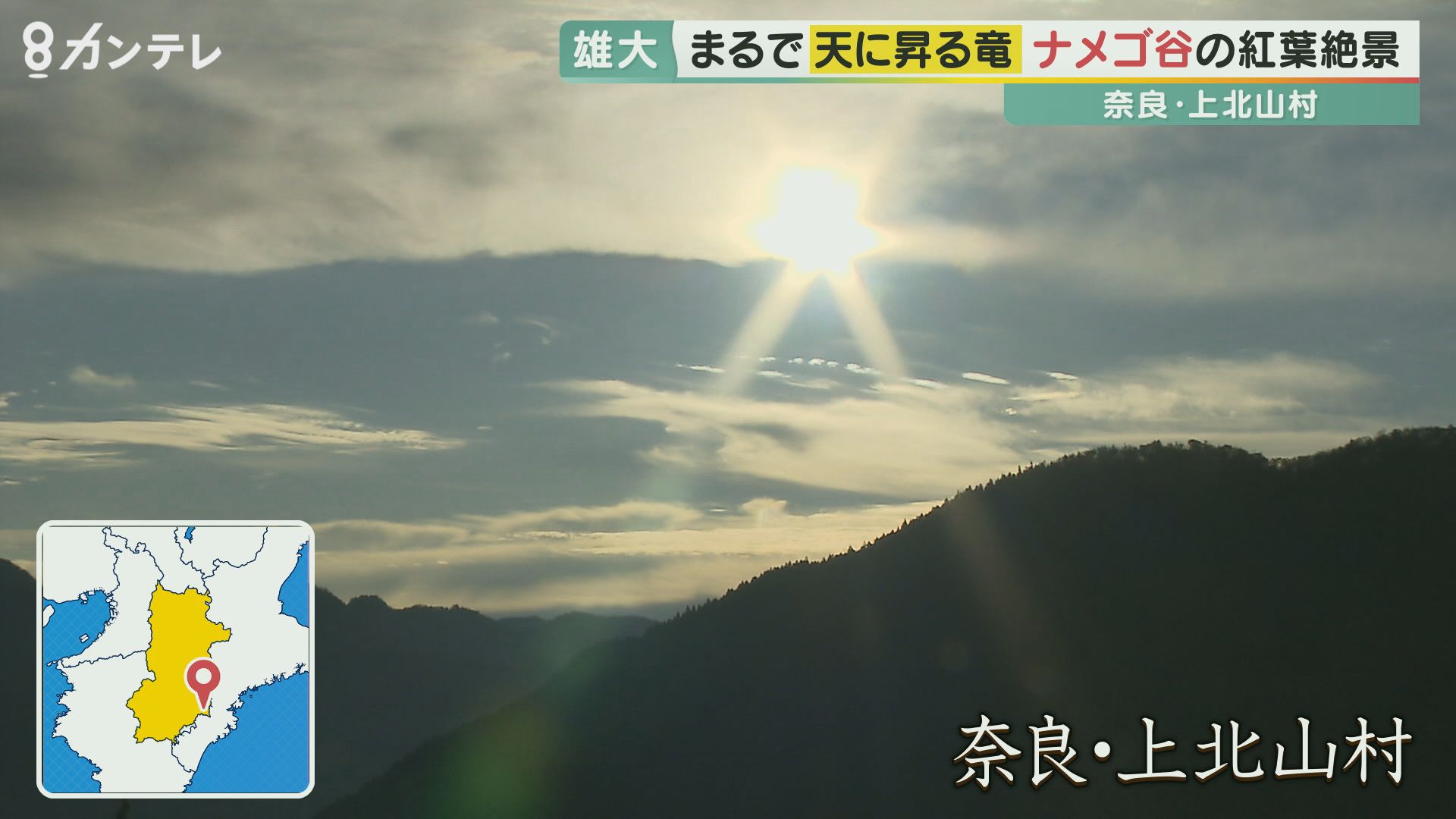 大台ケ原や大峰山脈に囲まれた、奈良県上北山村。この時期、多くの人が「あるもの」を目指してやってきます。濃い緑の山の尾根に沿って伸びる赤や黄色の筋。まるで“天に昇る竜”のようだと称される、ナメゴ谷の紅葉です。