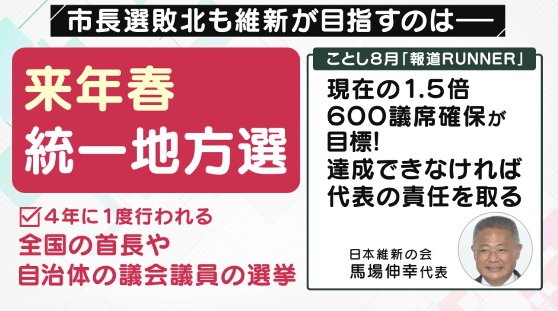 馬場代表は8月、「現在の1.5倍、600議席確保が目標!達成できなければ、代表の責任を取る」と明言しました。