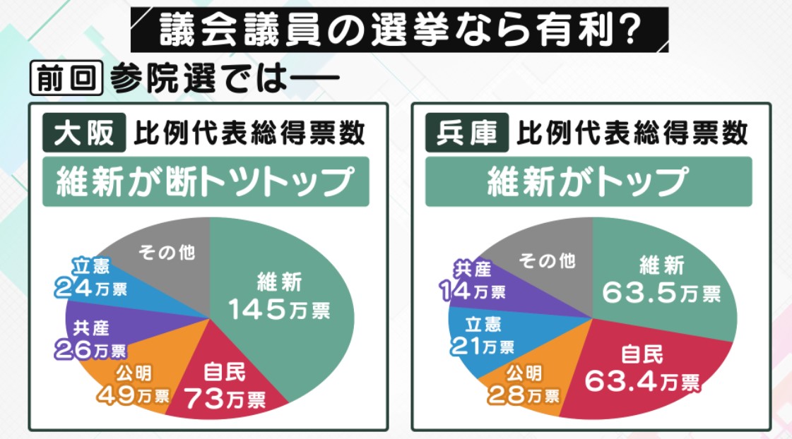 「前回の参院選の比例代表総得票数をみると、大阪では圧倒的に維新が強いんです。維新の強さというのは今の大阪の現状を物語っているのかと思いますが。一方の兵庫県もトップは維新ですが、自民との差は少なかった。今回の市長選の構図を見ても、『維新 vs. その他の政党』というかたちだったので、維新に対して他の政党が束になってしまうと、なかなか単独では勝てないという状況があったりします。ただ、あくまでも市長選というのは1対1の構図なので、『維新 vs. その他の政党』となってしまうと苦しいんですが、例えば議会選挙だと各党が候補者を立ててきますので、その中で維新がトップになれれば勝てますし、そういうかたちで、議会選挙と1対1の市長選挙では構図が違うのかなと思います」