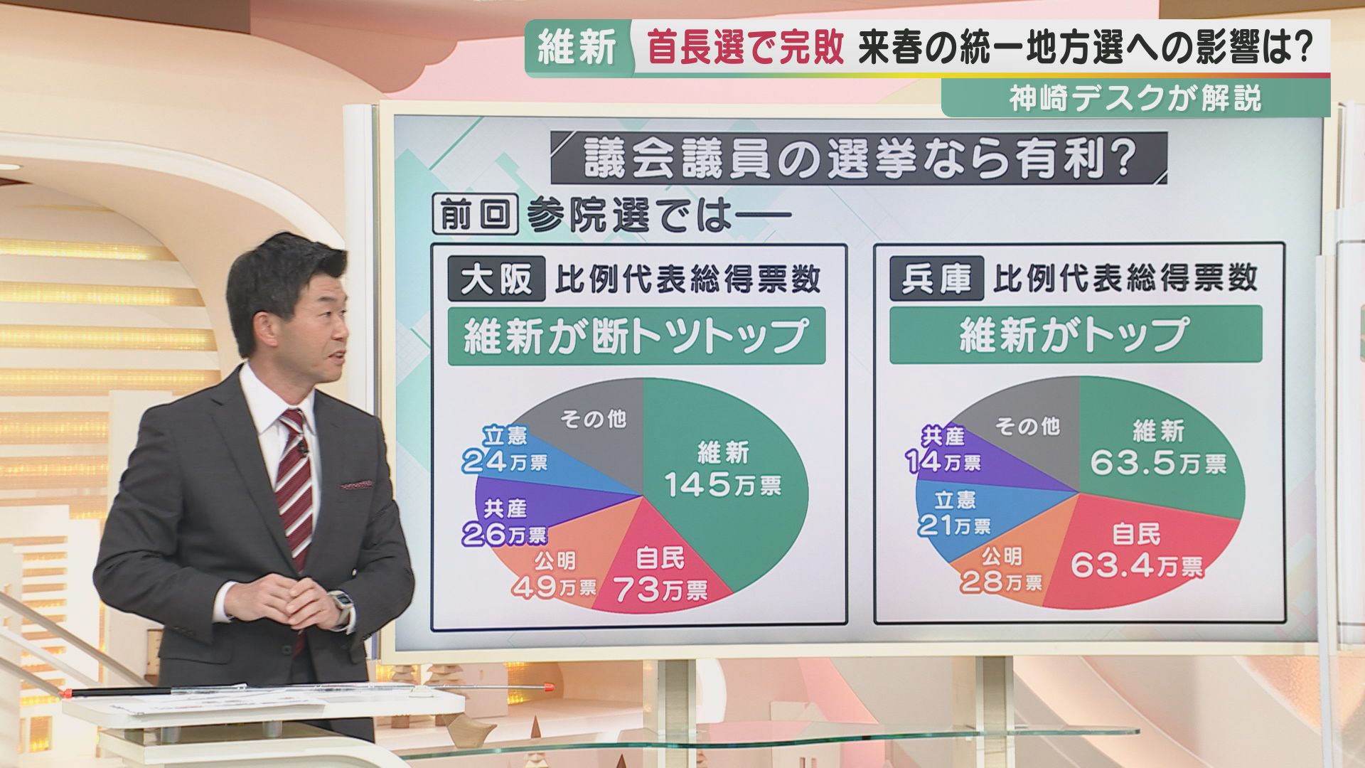 「今回の市長選は1対1の戦いということで、個人の力というのが非常に大きかったと思うんですけど、一方維新の場合、議会選挙などで“維新”の名前を重視されることがあって、大阪の府議会議員選挙や市議会議員選挙では、維新から出ているというだけで当選に近づくというのがあります。それがどうなのかという議論はありますが。馬場代表は次の統一地方選で『600議席』を目標にと言っていましたが、ある維新の幹部によると、『750議席』は取れるという自信を見せています。統一地方選がどうなるか、注目です」