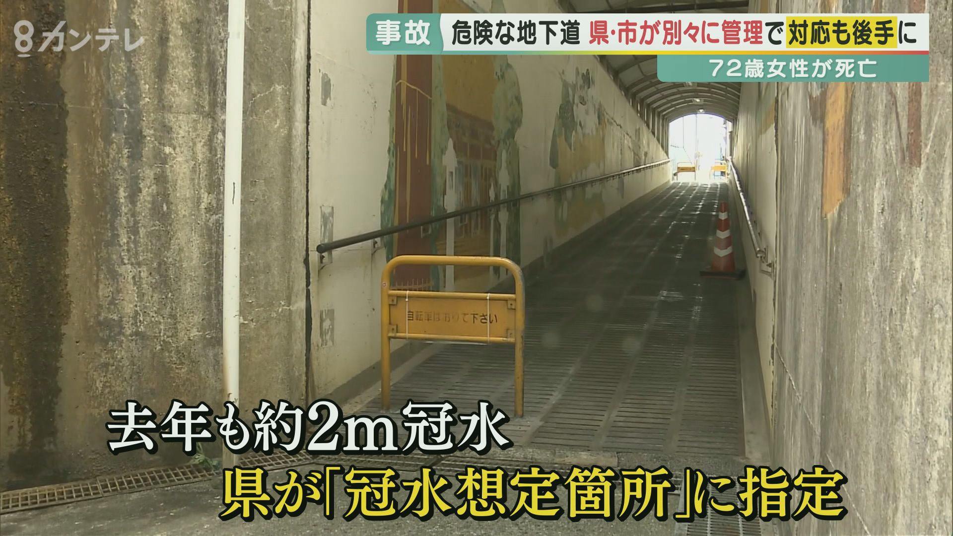 地下道冠水で72歳女性死亡…遺族が「県と市は安全対策を怠った」と訴え 1年前に2メートル冠水も対策取られず スロープは「市道」、地下道は「県道」も混乱の一因に (写真ギャラリー 13/21) 記事にもどる
