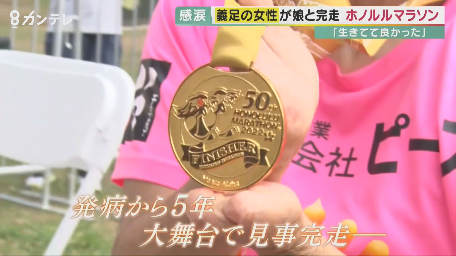 “電撃性紫斑病”の女性義足ランナーがホノルルマラソン駆け抜ける! 両足と両手指を失った母と伴走する娘2人 サポーターに囲まれ「栄光の金メダル」