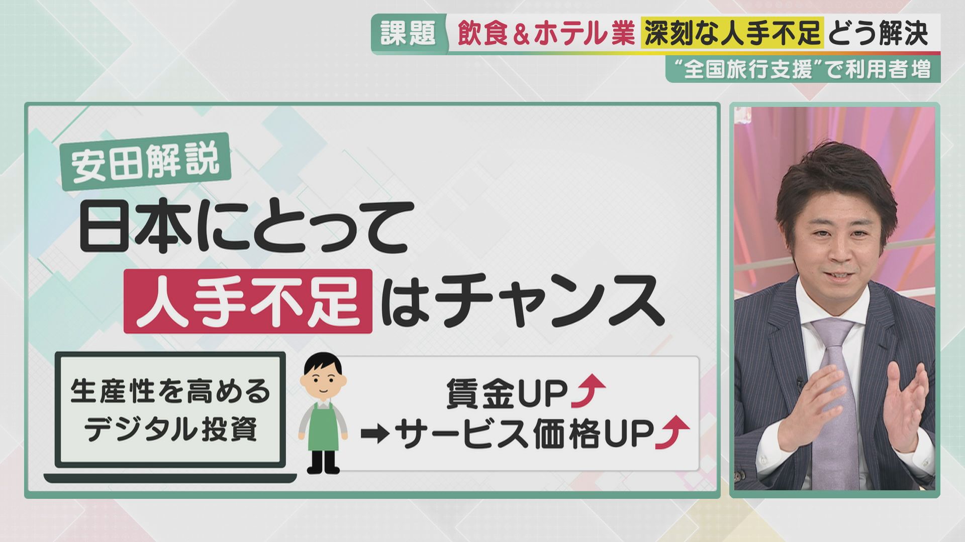 「まず人手不足が起こる背景として、お客さんが戻ってきている。景気が良くなっているということで、それ自体はいいことです。急に人材を確保することは難しいかもしれないですけど、従来と比べて時給を上げていく。今、物の値段が上がり始めているので、人気店は価格転嫁をしやすくなっていて、それが賃金アップにもつながる。また、タブレットを使用した省人化・省力化の取り組みもこの2~3年で随分進んでいます。急激に需要が増えたので難しいとは思うんですけど、長い目で見ると、賃金アップとデジタル化への投資で生産性を高めることで、日本経済全体を強くする方向に向かっていくと思うんです」