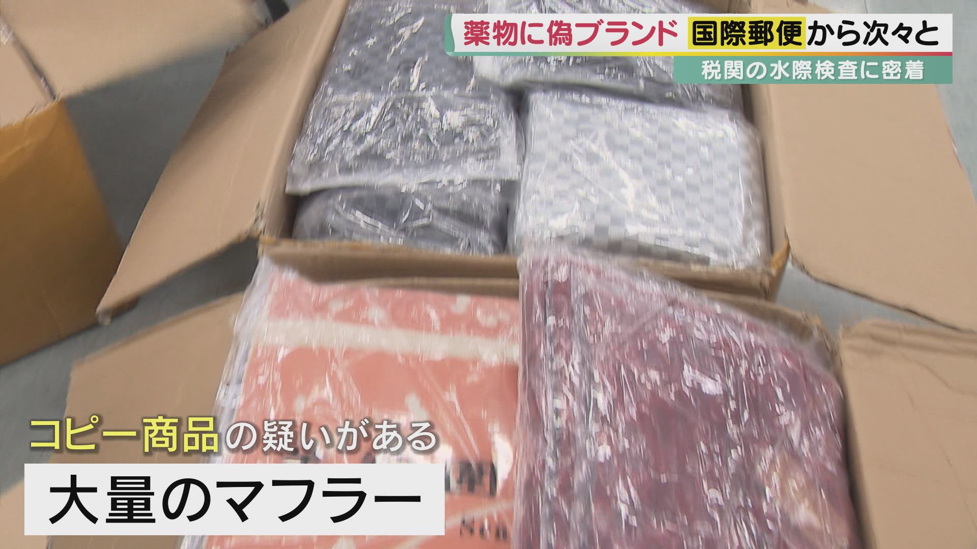 検査を始めて4時間。この日一番怪しい荷物を手にした坂上さん。中を開けると入っていたのは…ブランドのロゴが入った大量のマフラー。