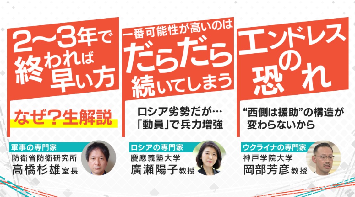 高橋室長は「2~3年で終われば早い方」、ロシアの専門家の慶應義塾大学・廣瀬陽子教授は「一番可能性が高いのは、だらだら続いてしまうこと」、ウクライナの専門家の神戸学院大学・岡部芳彦教授は、「エンドレスの恐れ」と、3人とも長期化するという見方です。
