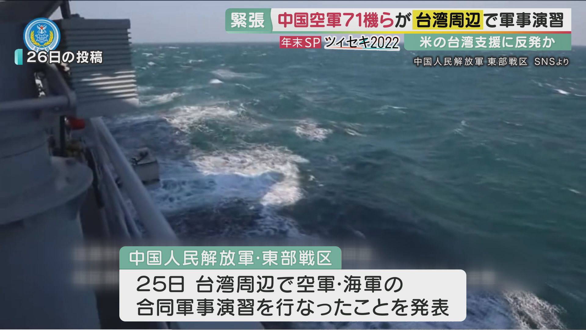中国人民解放軍・東部戦区のSNSは、中国軍が12月25日に台湾周辺で空軍・海軍の合同軍事演習を行ったと投稿。台湾国防部も、26日午前6時までの24時間で、中国の空軍機71機と7隻の戦艦を台湾周辺で確認したとしています。