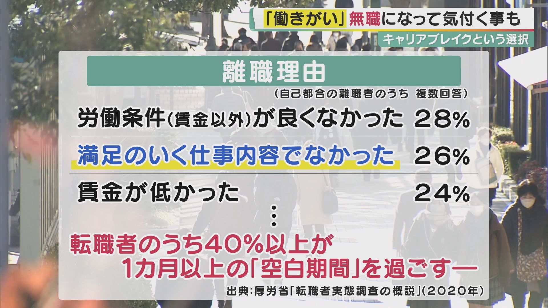 厚生労働省の調査によると、自己都合で離職した人のうち、26パーセントが「仕事内容に満足できなかった」と回答。また、転職した人のうち40パーセント以上の人が、仕事を離れる「空白期間」を1カ月以上過ごしています。