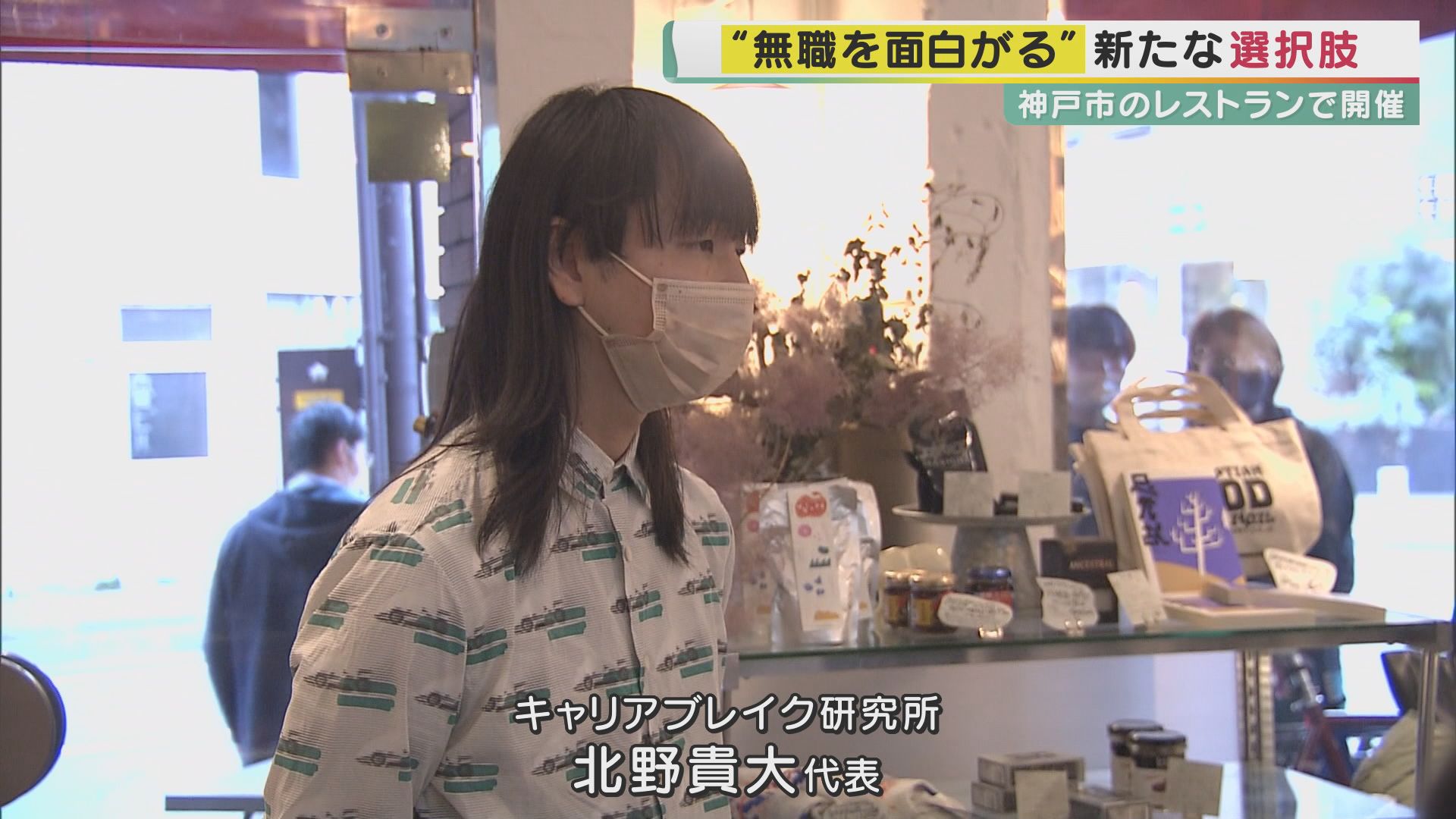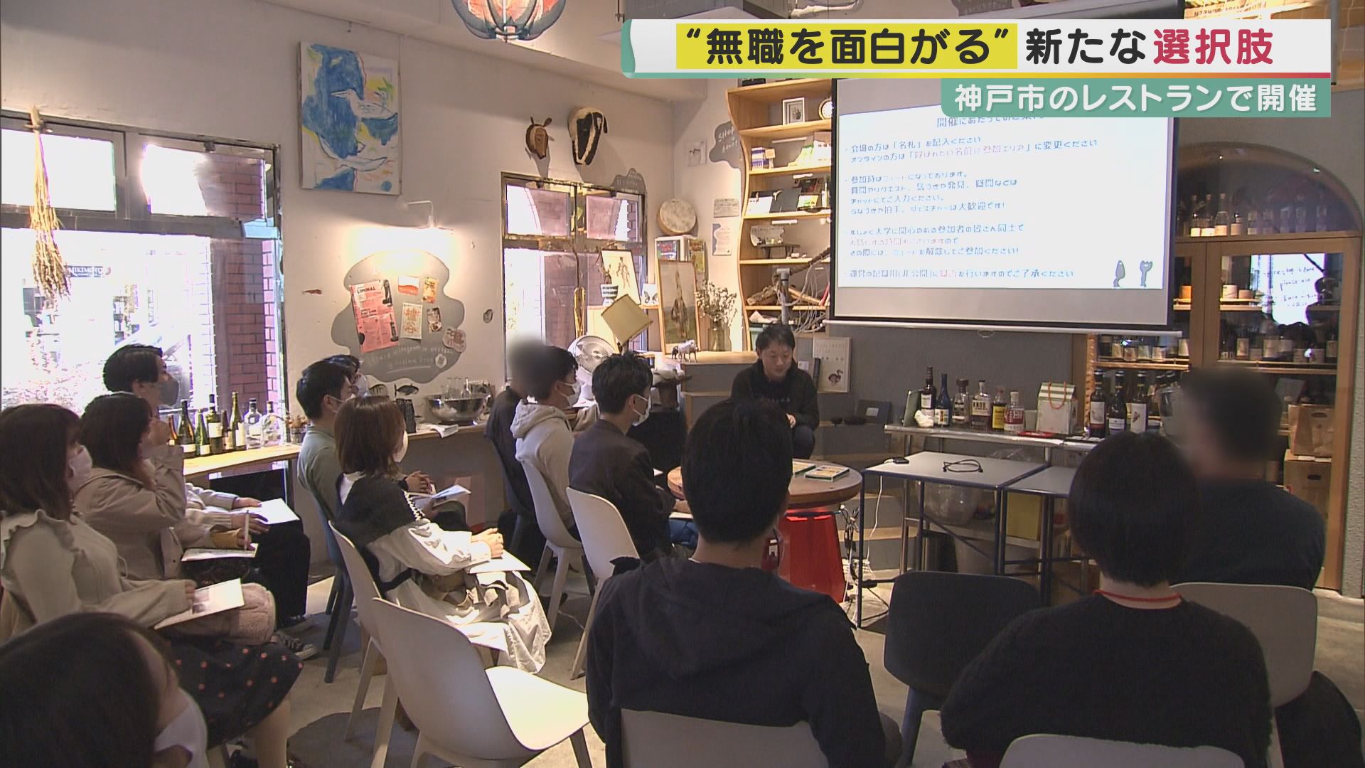 神戸市内のレストランで、開かれたイベント。テーマは「無職」です。現在無職の人や、今の仕事にやりがいが見いだせず、悩んでいる人などが参加していて、様々な考えを学びあえる場として「むしょく大学」と名づけられています。