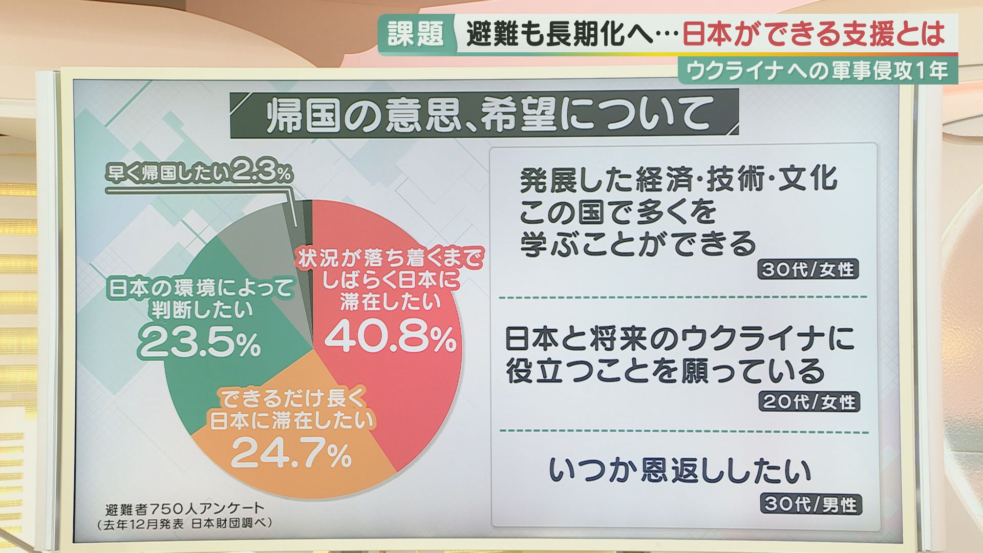 滞在したいと答えた人の中では「発展した経済・技術・文化などをこの国で多くを学ぶことができる」や「日本と将来のウクライナに役立つことを願っている」、「いつか恩返ししたい」という意見がありました。