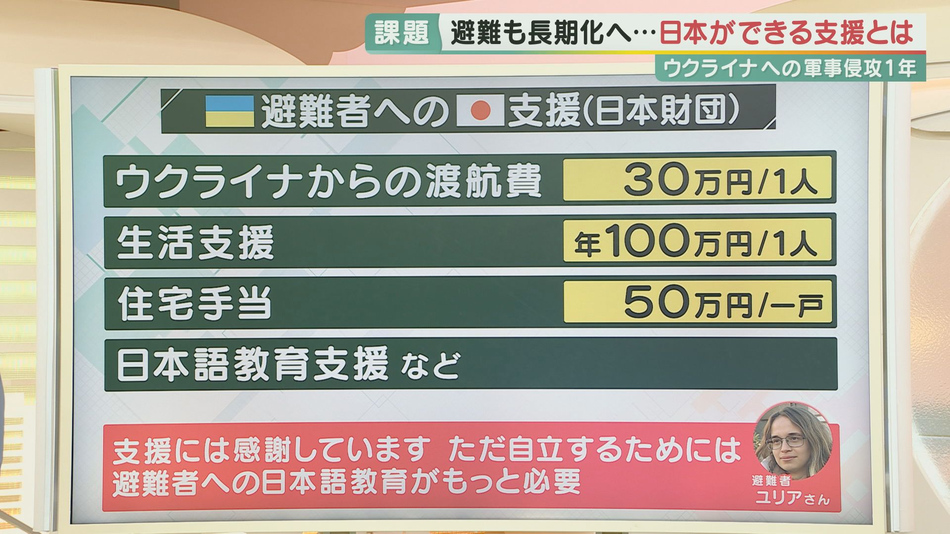 日本への避難者に対して日本財団では、ウクライナからの渡航費が1人当たり30万円、生活支援で1人当たり年間100万円、住宅手当で一戸当たり50万円を支援していて、期限は3年間となっています。