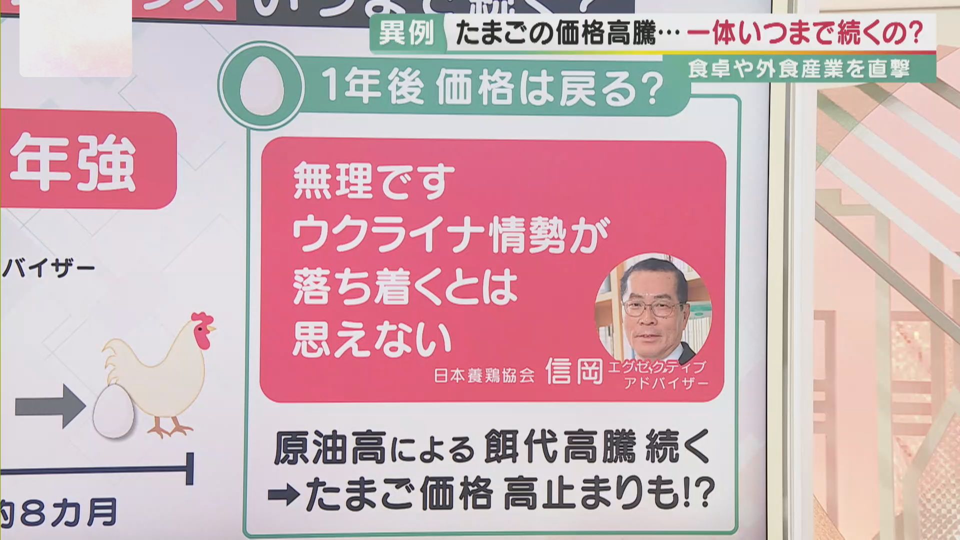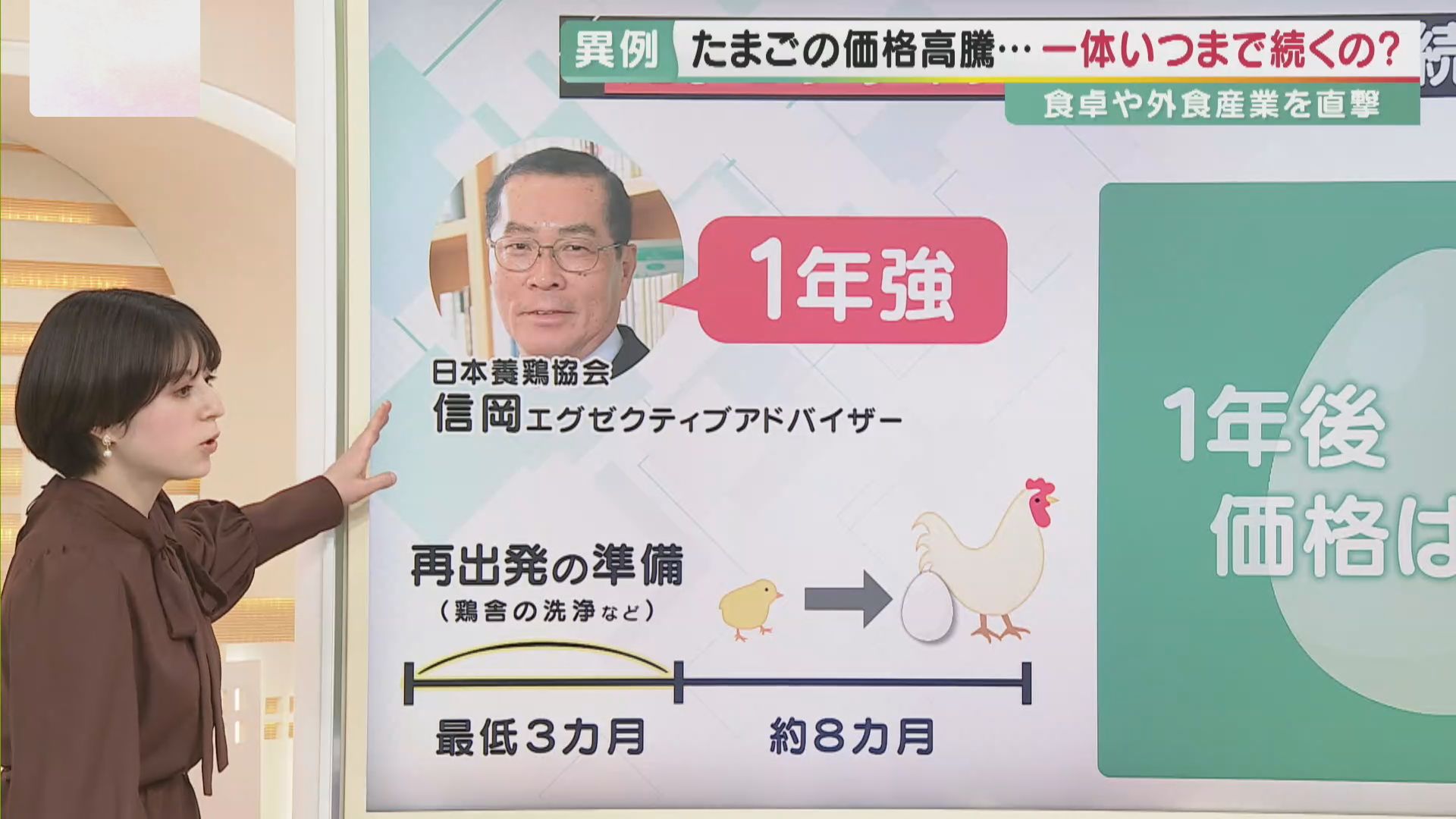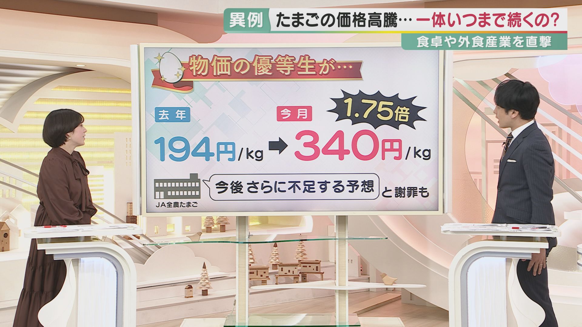 そうなると、卵の価格はこのまま高止まりする可能性もあるということです。「たまごクライシス」、まだまだ厳しい時期が続きそうです。