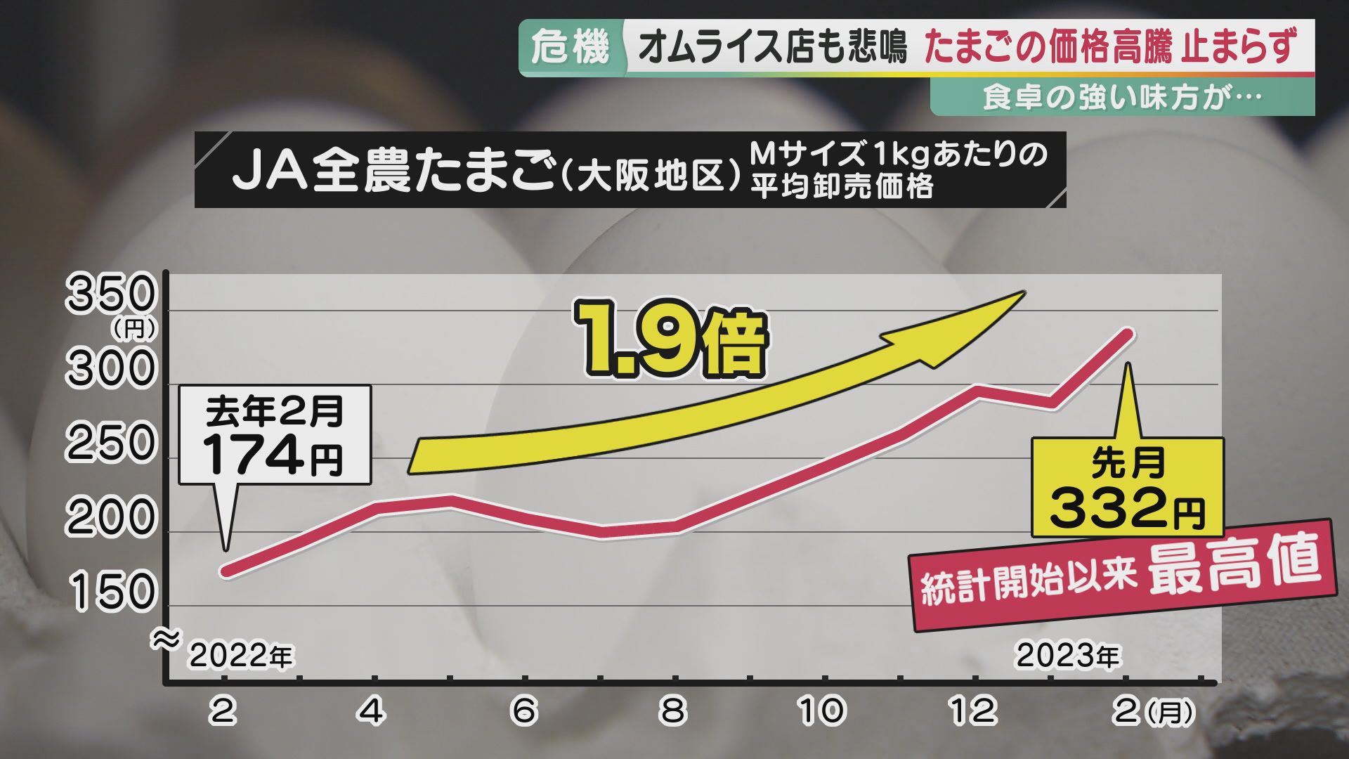 JA全農たまごによると、Mサイズ1キロ当たりの大阪地区の平均卸売価格は、2月で332円。前年同月に当たる2022年の2月から158円値上がりし、1.9倍になっていて、公表している1993年以降では最高値となっています。 最高値となった背景には、卵を産むニワトリの餌代が高騰していることもありますが…