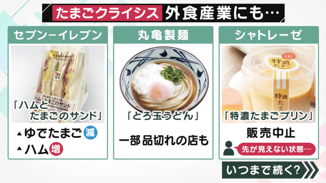 セブンイレブンは、販売する「ハムとたまごのサンド」のゆで卵の量を減らし、ハムの量を増やして対応しています。また丸亀製麺は、とろ玉うどんが一部店舗で品切れ。シャトレーゼでは「特濃たまごプリン」が販売中止となっていて、担当者によると「先が見えない状態…」と困ったように話していました。