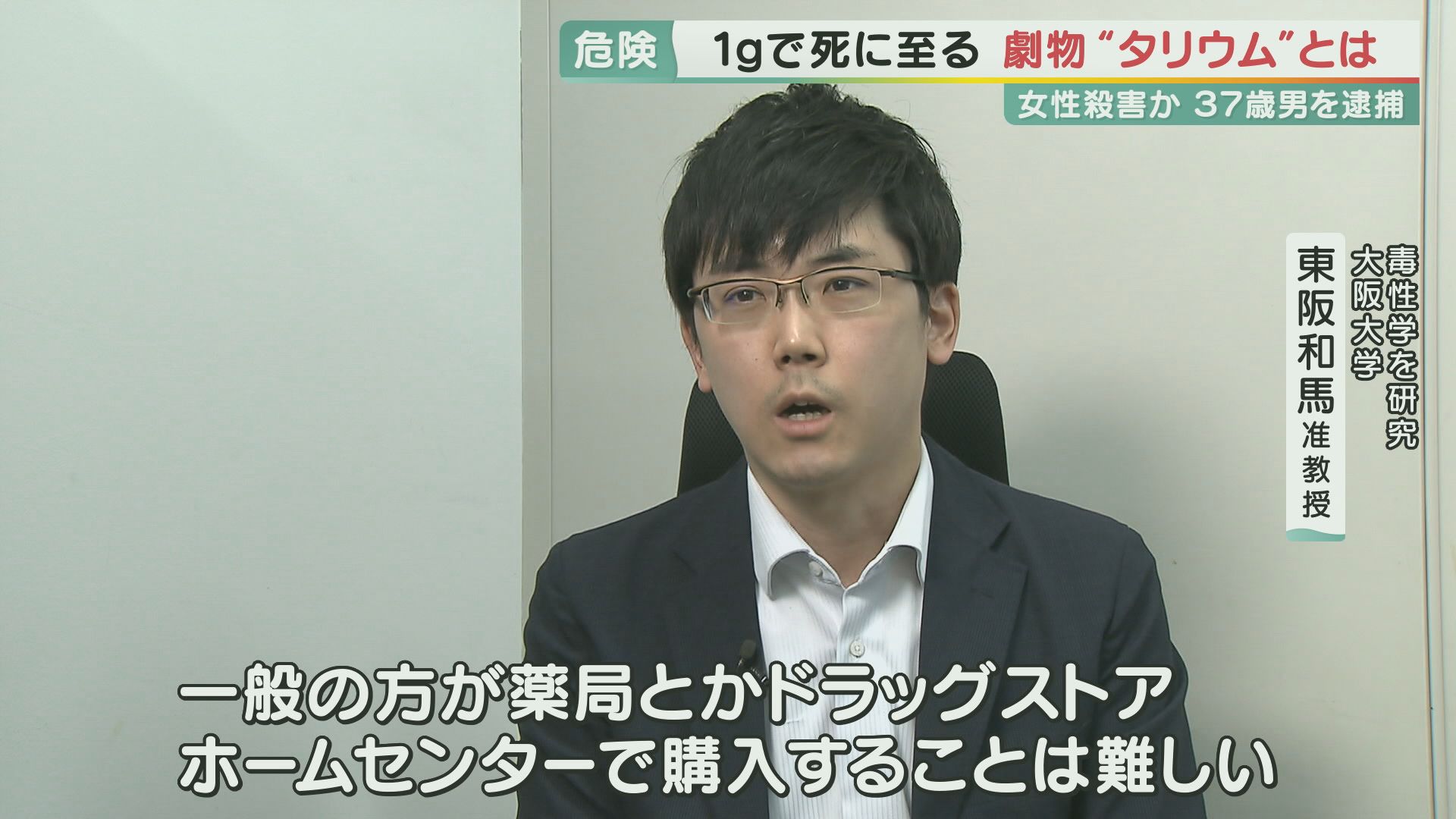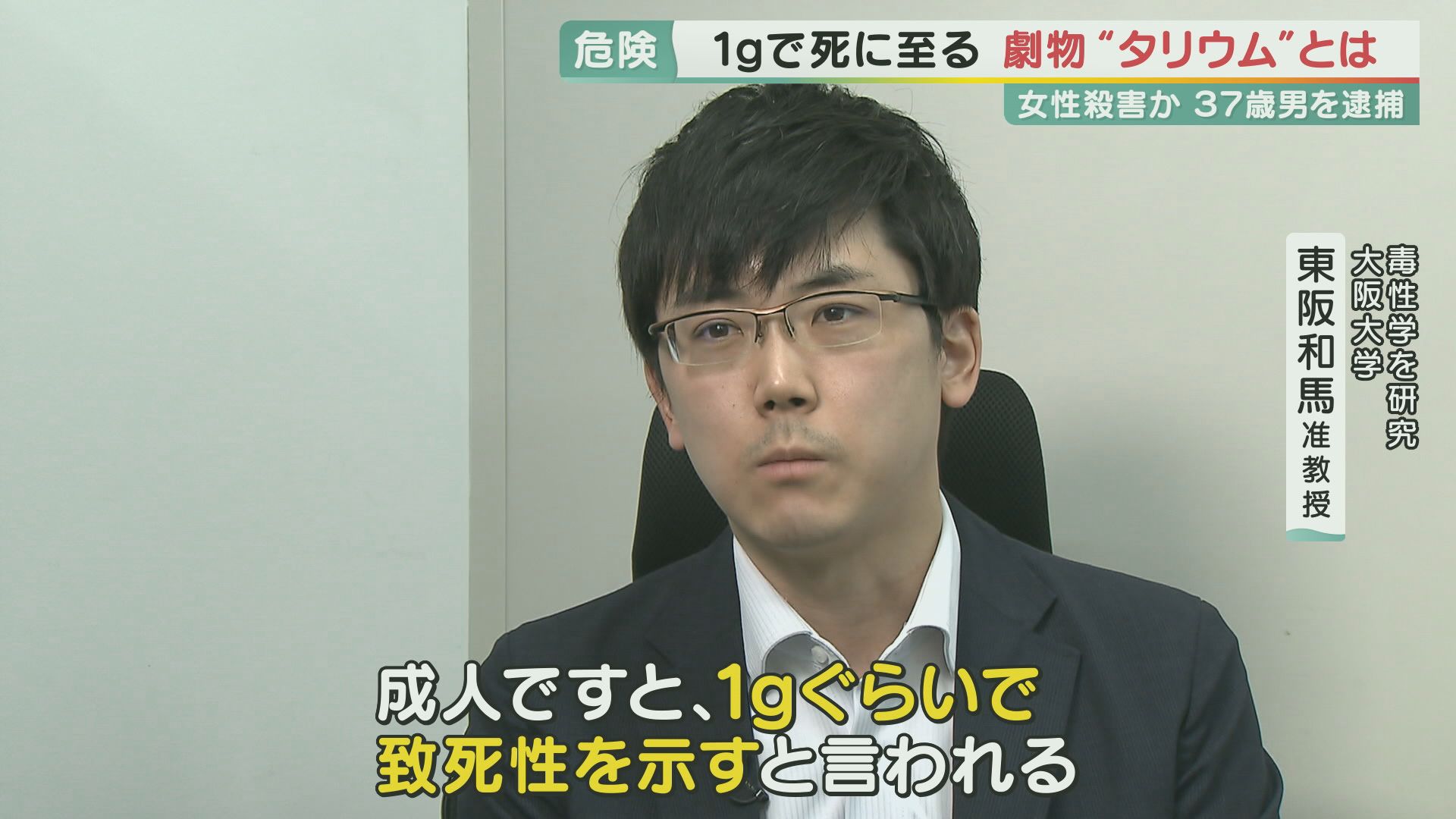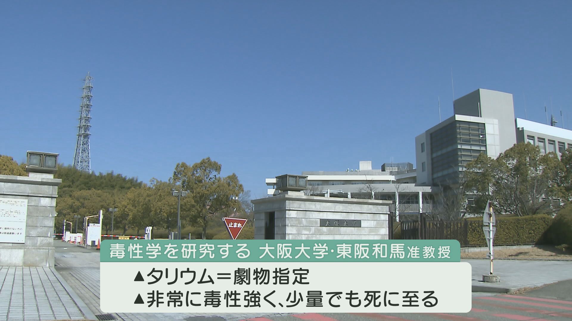毒性学を研究する大阪大学の東阪准教授は、「タリウム」について、法律では「劇物」に指定されていて、非常に毒性が強く、少量でも死に至ることもあると話します。