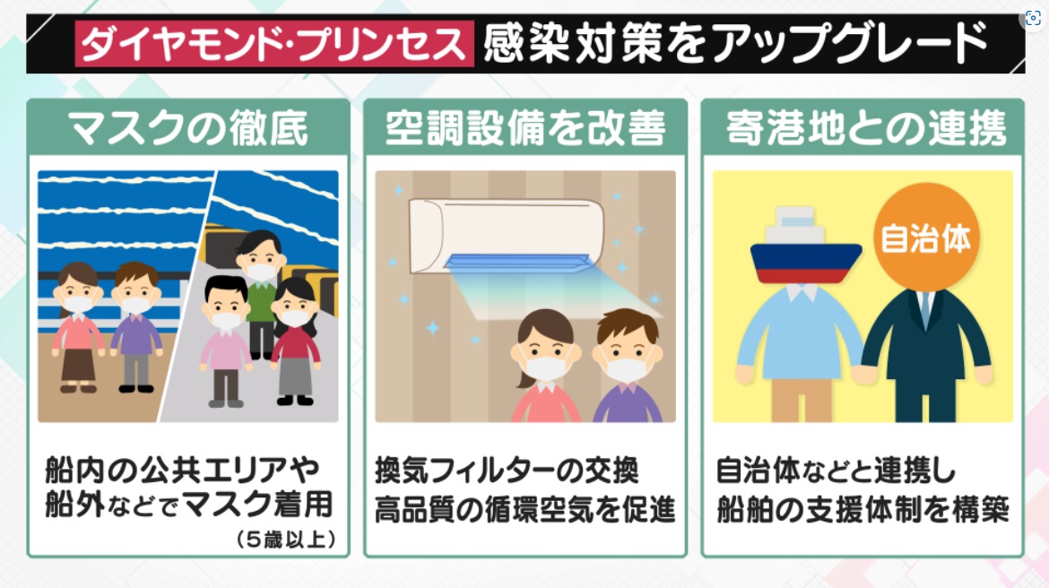 ダイヤモンド・プリンセスでは、前提として、ワクチン接種3回とPCR検査が必要になっています。その他に具体的な感染対策として、