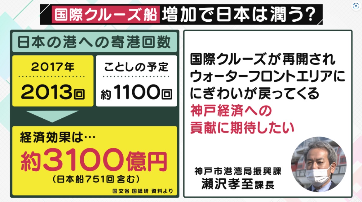 2017年の経済効果は、日本船が寄港した751回を含む計算で、約3100億円ということです。その半分ほどは見込めるのではということです。