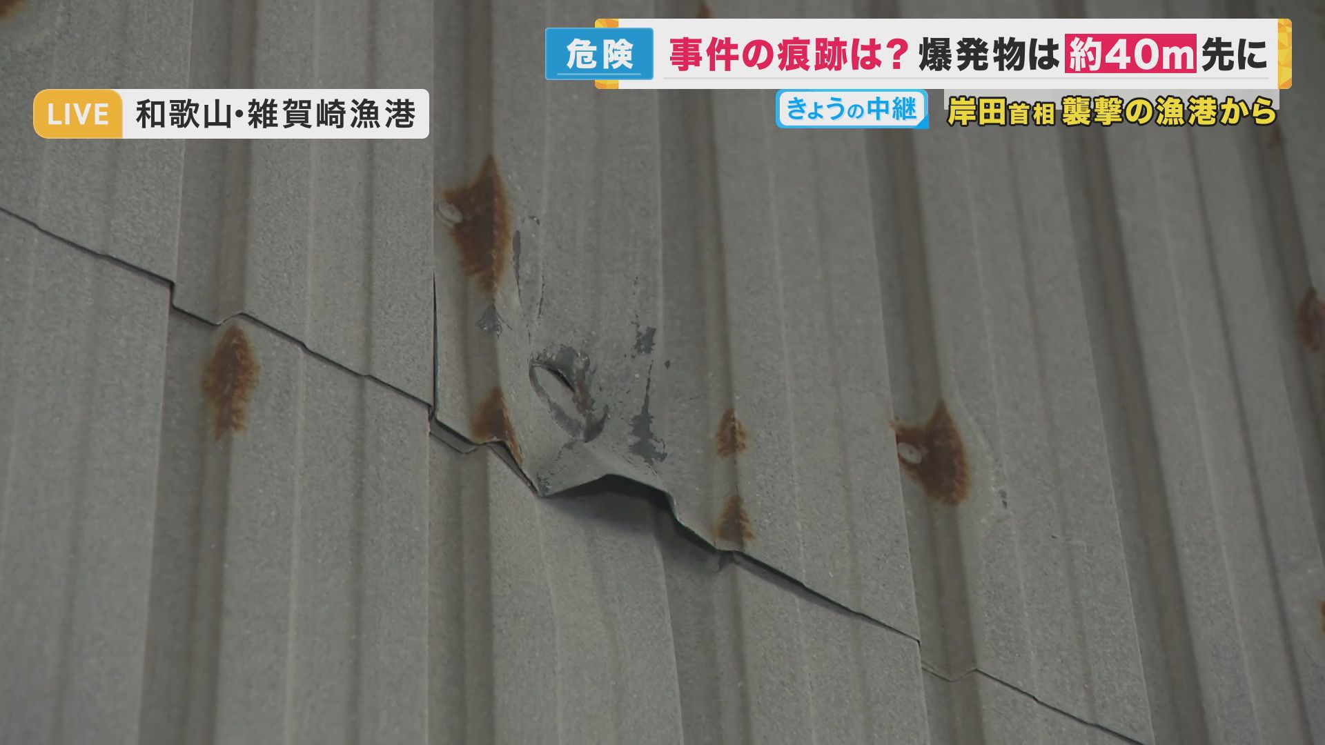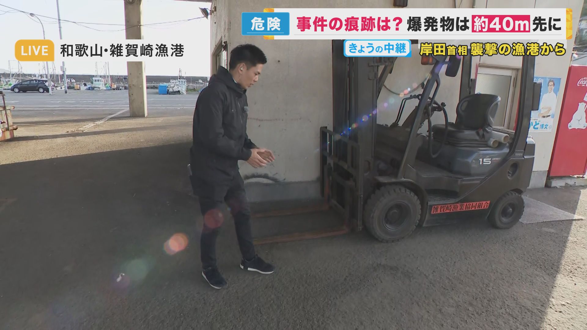 爆発物に関してですが、投げた後に白いチョークの痕がある辺り、爆発物が落下した場所とみられます。落下した後、SPの方がはじきました。こちらにある黒く焼け焦げたようなところで、約1分後に爆発したものとみられます。漁協関係者によりますと、現場検証の際に、ここに5個、6個ほどナットが落ちていたということです。それが爆発によって飛んだものだとみられます。