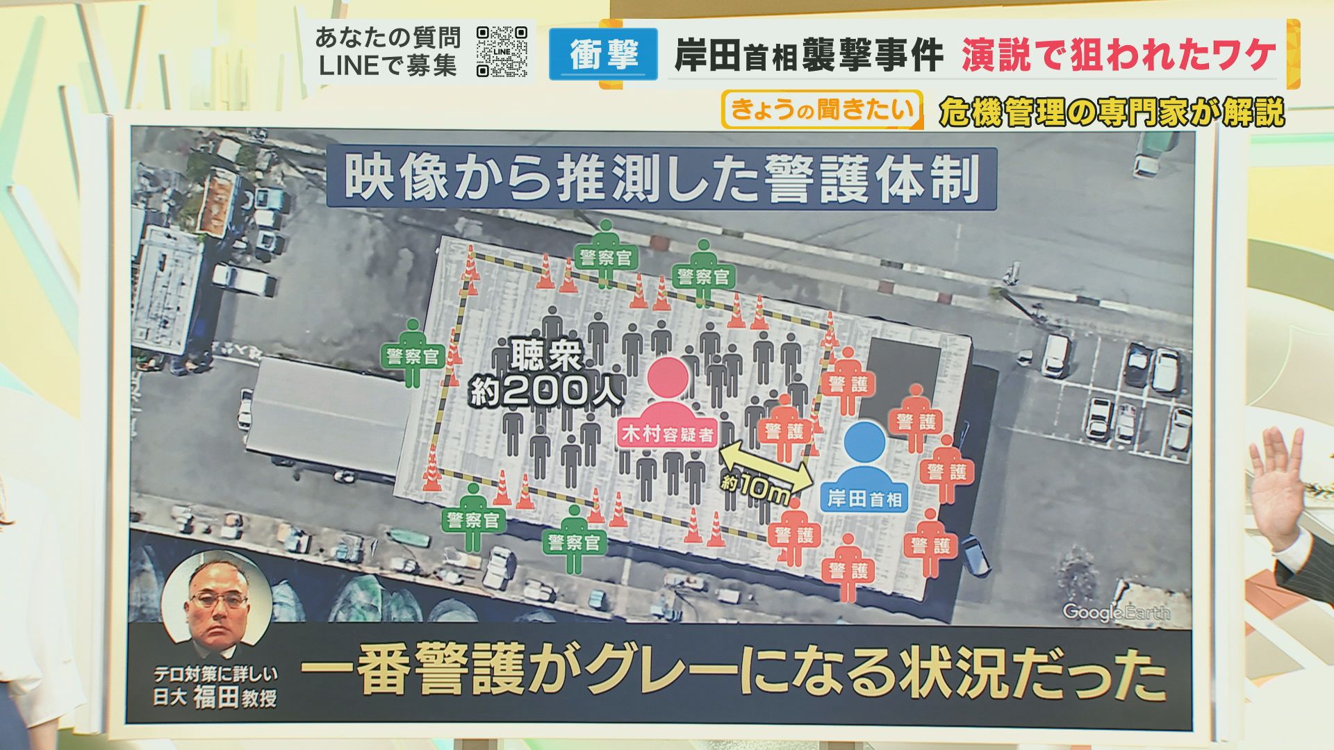 岸田首相が演説を始める直前、木村容疑者と首相との距離はおよそ10メートル。SPがいるにもかかわらず、事件は起こりました。