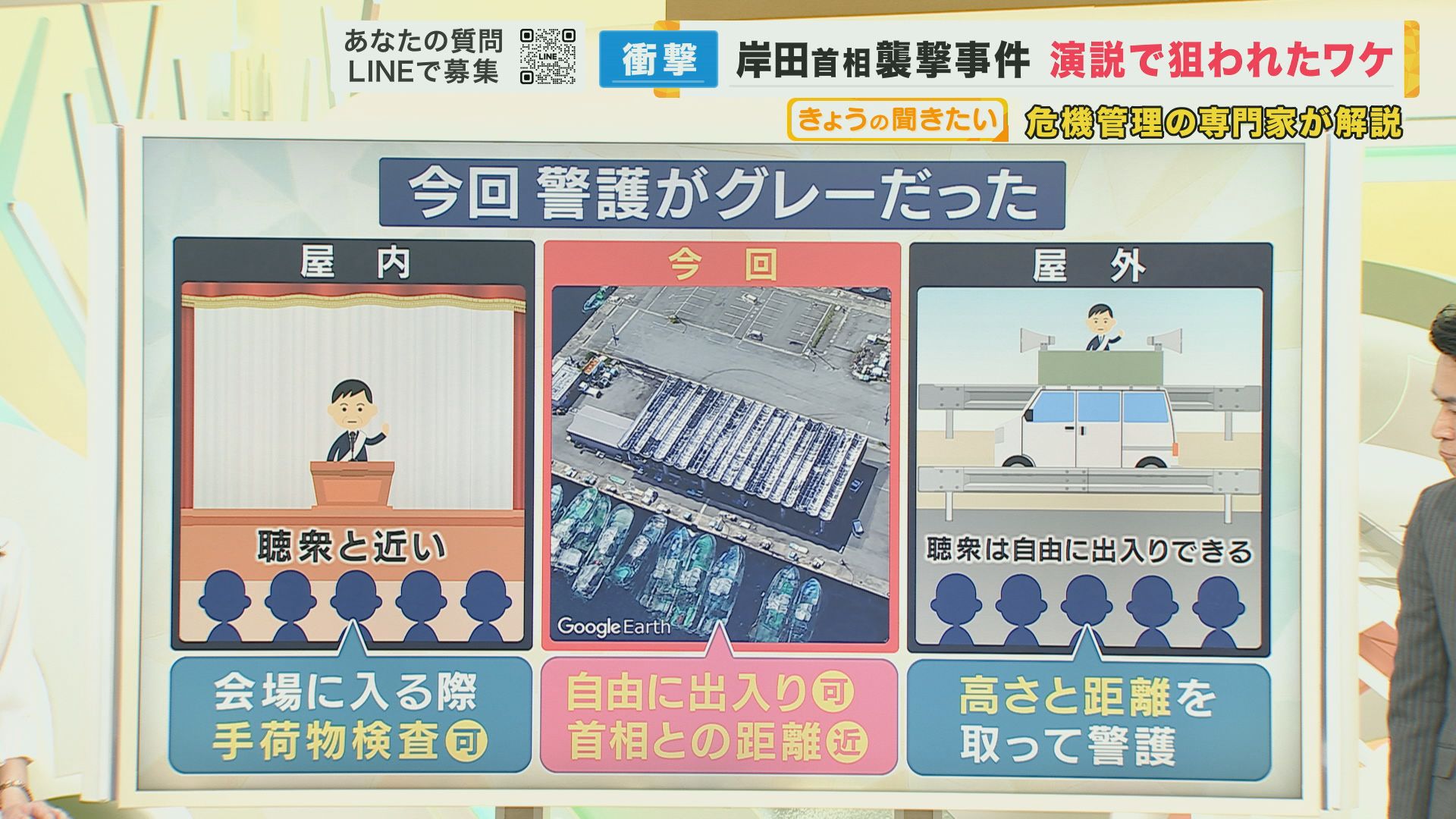 「これまでの選挙でも屋内パターンの警護であれば、受付で名前や住所を書くことで、事件を起こしにくかった。さらに手荷物検査とかができればベストですが。また、屋外パターンの警護もこれまでやっていた方法なんです。どちらかで徹底できていればこんな事件が起きなかった。今回は屋内でも屋外でもないグレーな状況で、会場に入る時の規制もできていませんし、手荷物検査もできていない。一方で屋外警護のように高さと距離を置けていない。どちらもできていないという意味では警護計画は不完全で問題があったと思います」