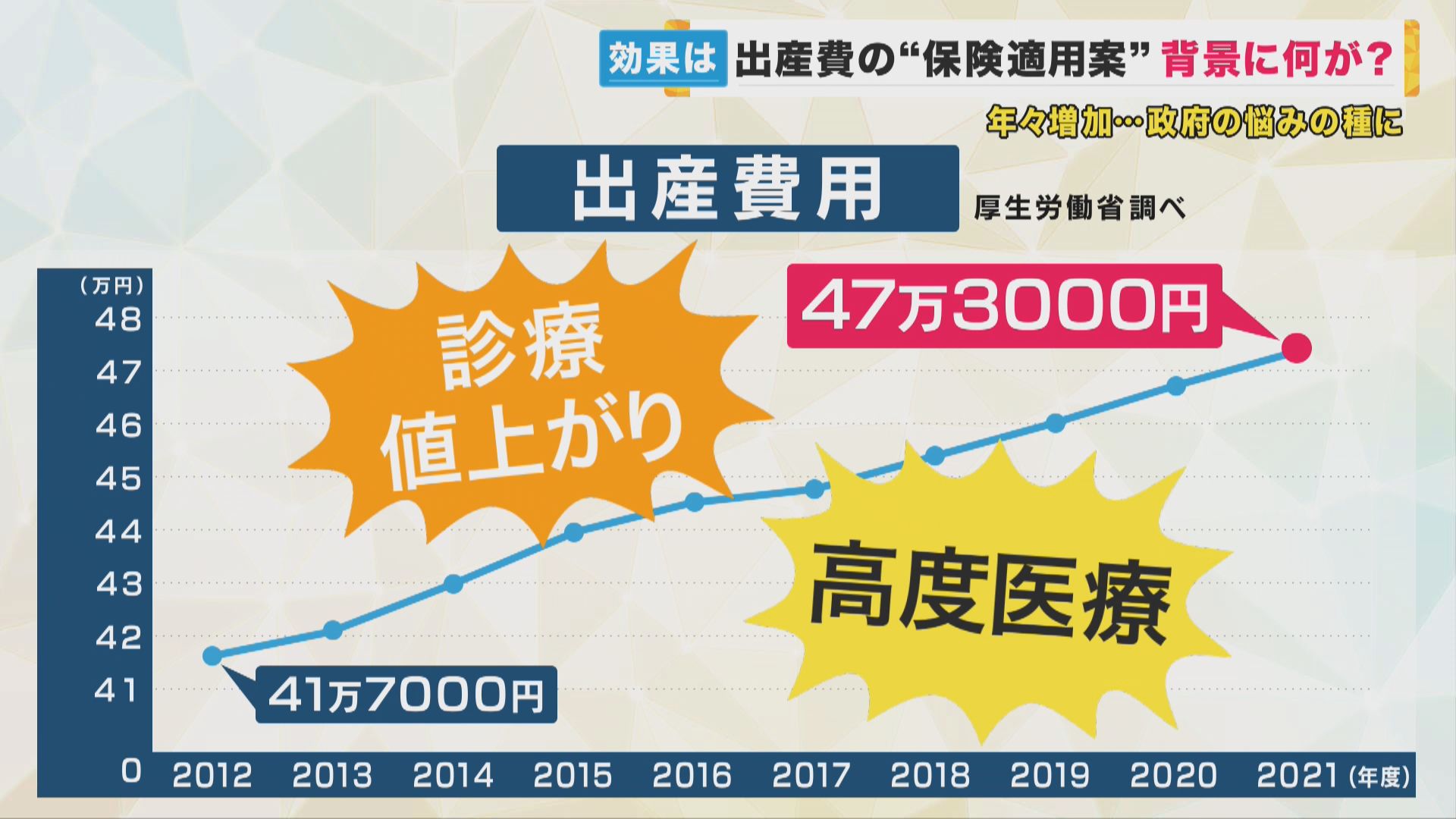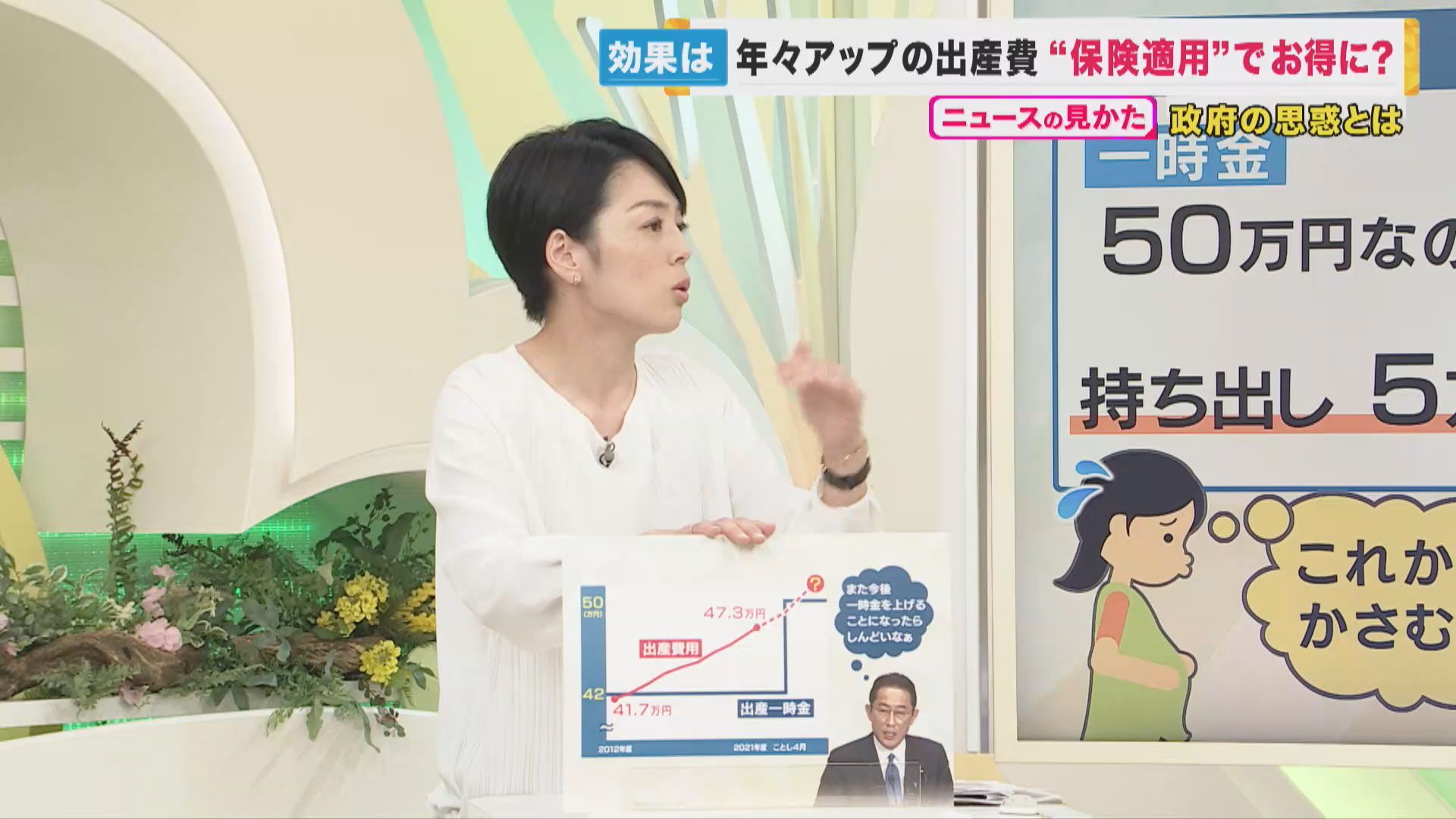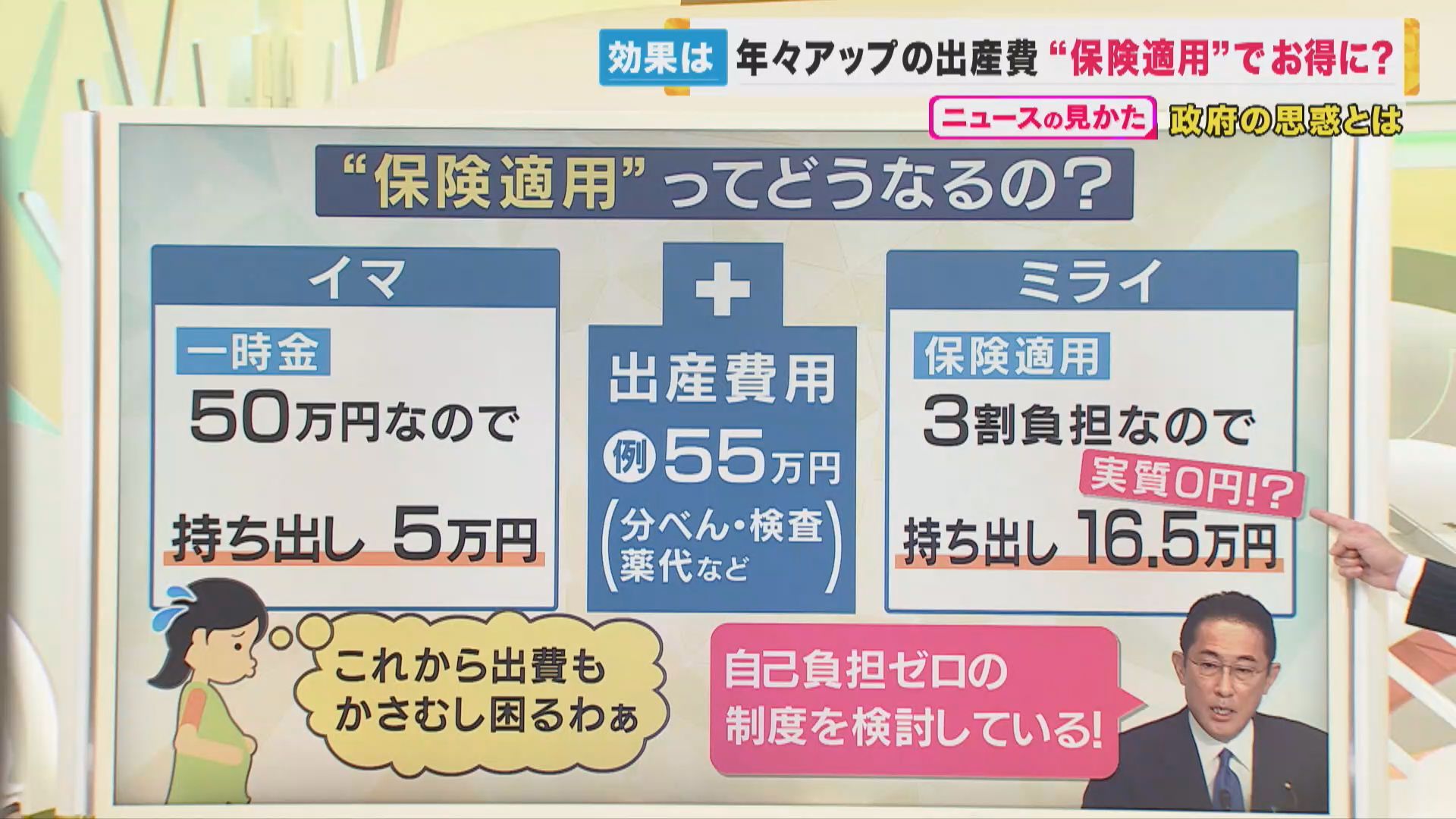 「出産一時金は増えているんですが、出産費用も同様にあがっています。なぜなら少子高齢化で利用する人が減っているにも関わらず、病院にかかる固定費はかかるためで、診察料に上乗せされています。さらに出産一時金を上げると、病院がほかの部分で費用を上げるという“いたちごっこ”になってしまっている現状があります。保険適用にすれば、無駄な競争を抑えられるのではないかという考えがあります」