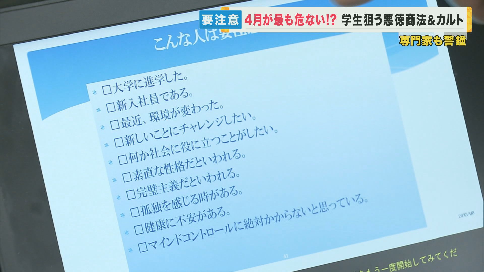 「これマインドコントロールに注意する人たちなんです。新入社員も同じなんですけど。自分の家庭環境から離れて引っ越したりもするし。その時がむしろねらい目なんです」