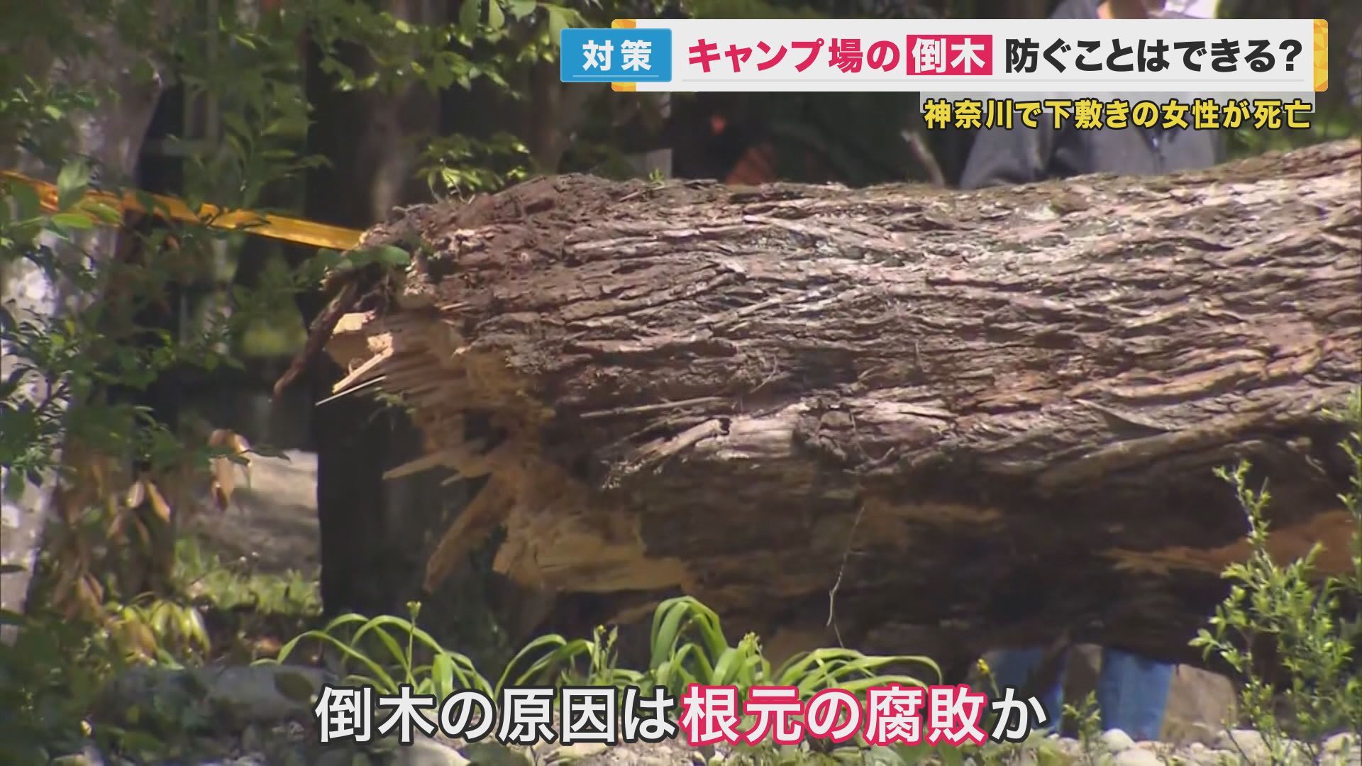 4月16日、神奈川県相模原市のキャンプ場で高さ18メートルの木が倒れ、テントで寝ていた夫婦が下敷きになり、妻の中村まりなさん(29)が死亡しました。木が倒れたのは、根元の腐敗が原因とみられています。周辺の木について、従業員は、「毎朝確認していた」と話しているということですが、警察は、点検方法などに問題がなかったかどうか、詳しく調べています。