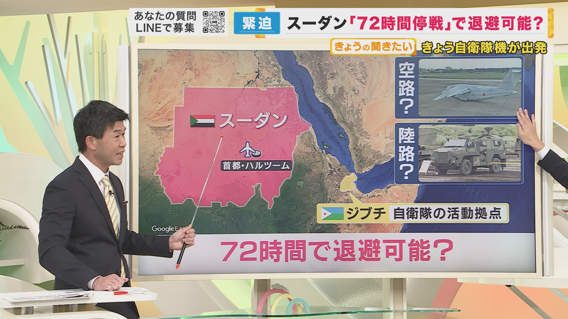 72時間で日本人の退避ができるのか。可能性としては空路と陸路があります。自衛隊の活動拠点となるジプチに自衛隊機を派遣したところですが、そこから空路で行くのか、陸路で行くのかが問題です。