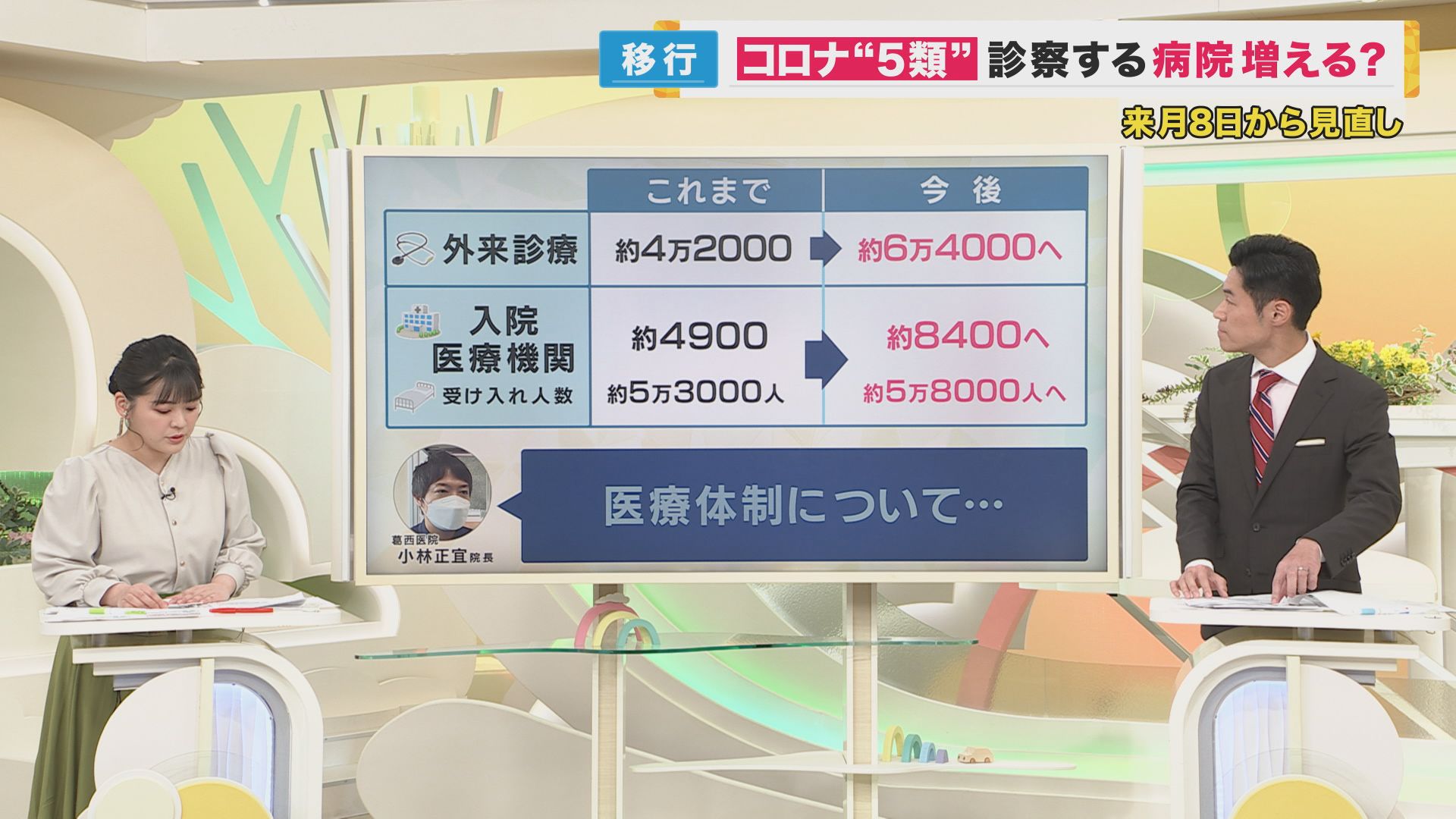 厚生労働省によりますと外来診療についてはこれまで全国で約4万2000の医療機関で行っていたそうですが「5類」移行後は約6万4000の医療機関で受け入れる体制を目指すとしています。
