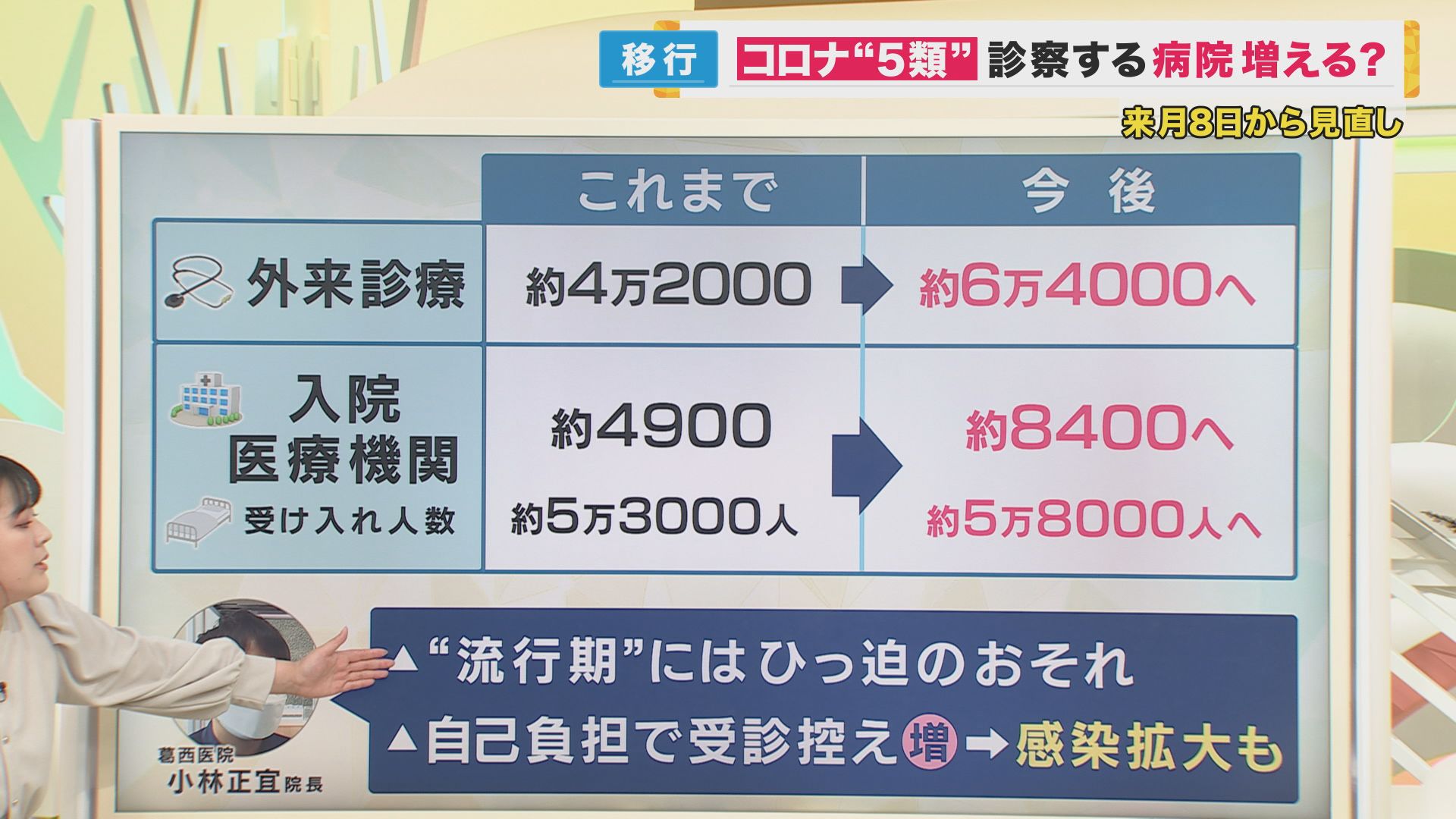 「5類」に移行し通常の診療に組み込むため負担が少なくなるよう、以前はプレハブでしていた発熱外来の大部分を病院内で行うようにしました。しかし診察を行う葛西医院の小林正宣院長は「5類」移行に懸念を示します。