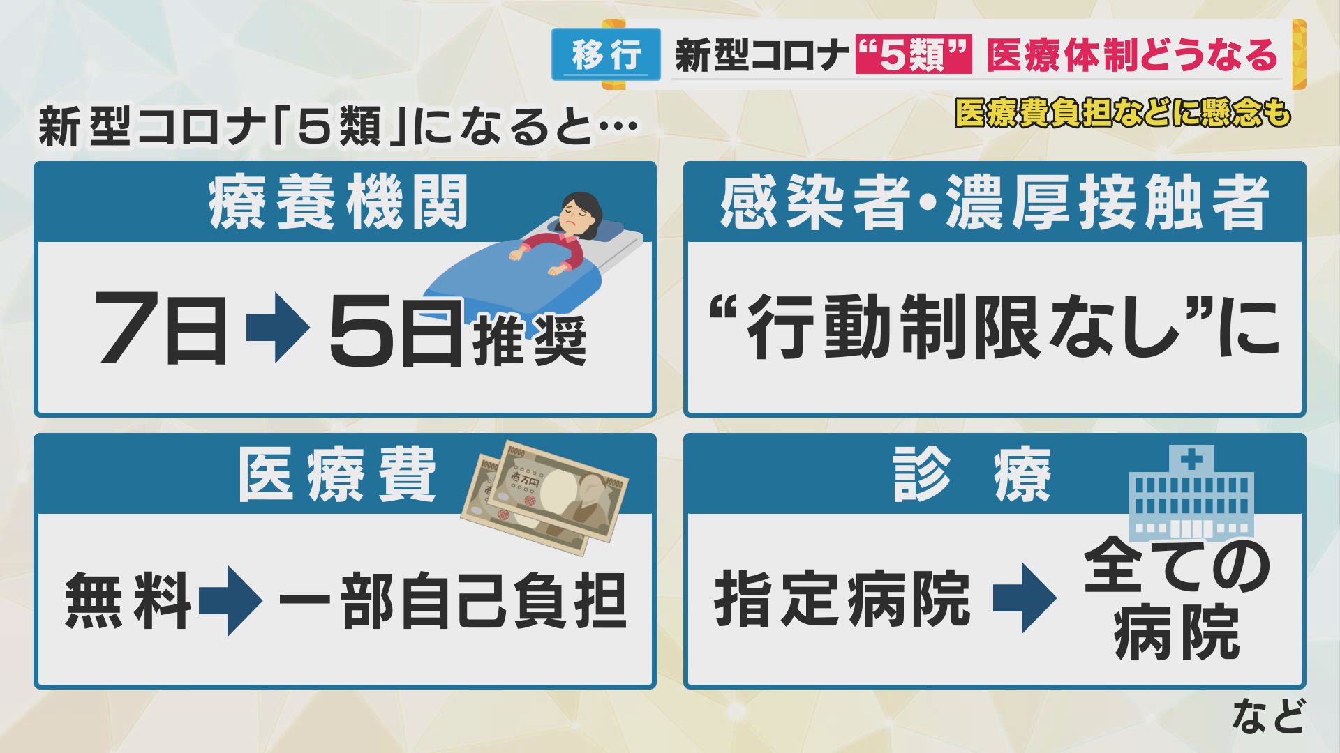 公費負担だった医療費は一部自己負担に。発熱外来など一部でしかできなかった外来の受け入れは全ての医療機関でできるようになります。