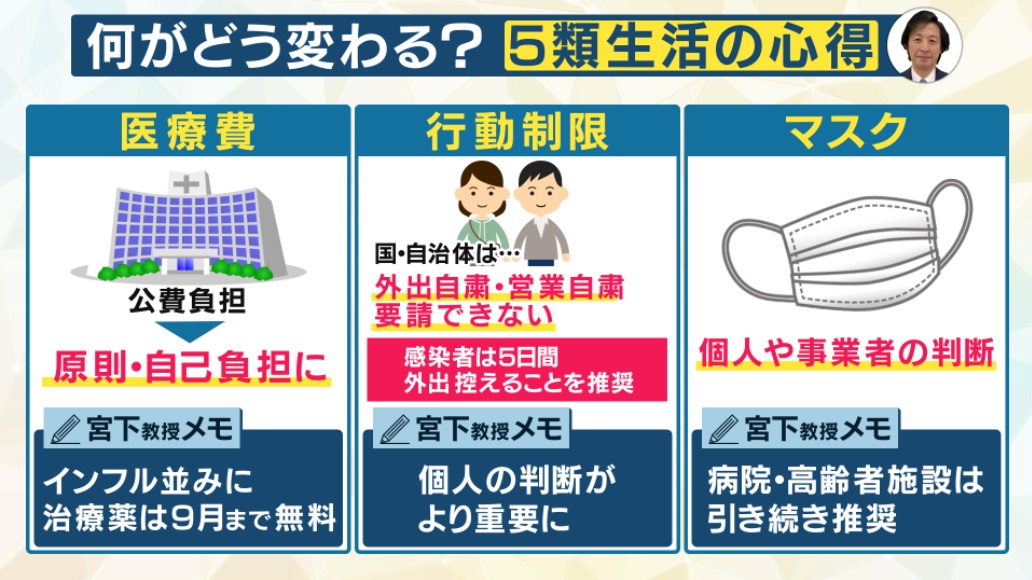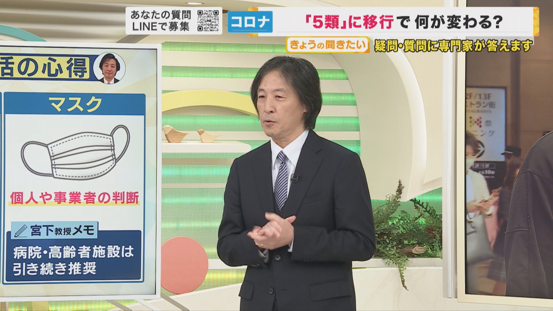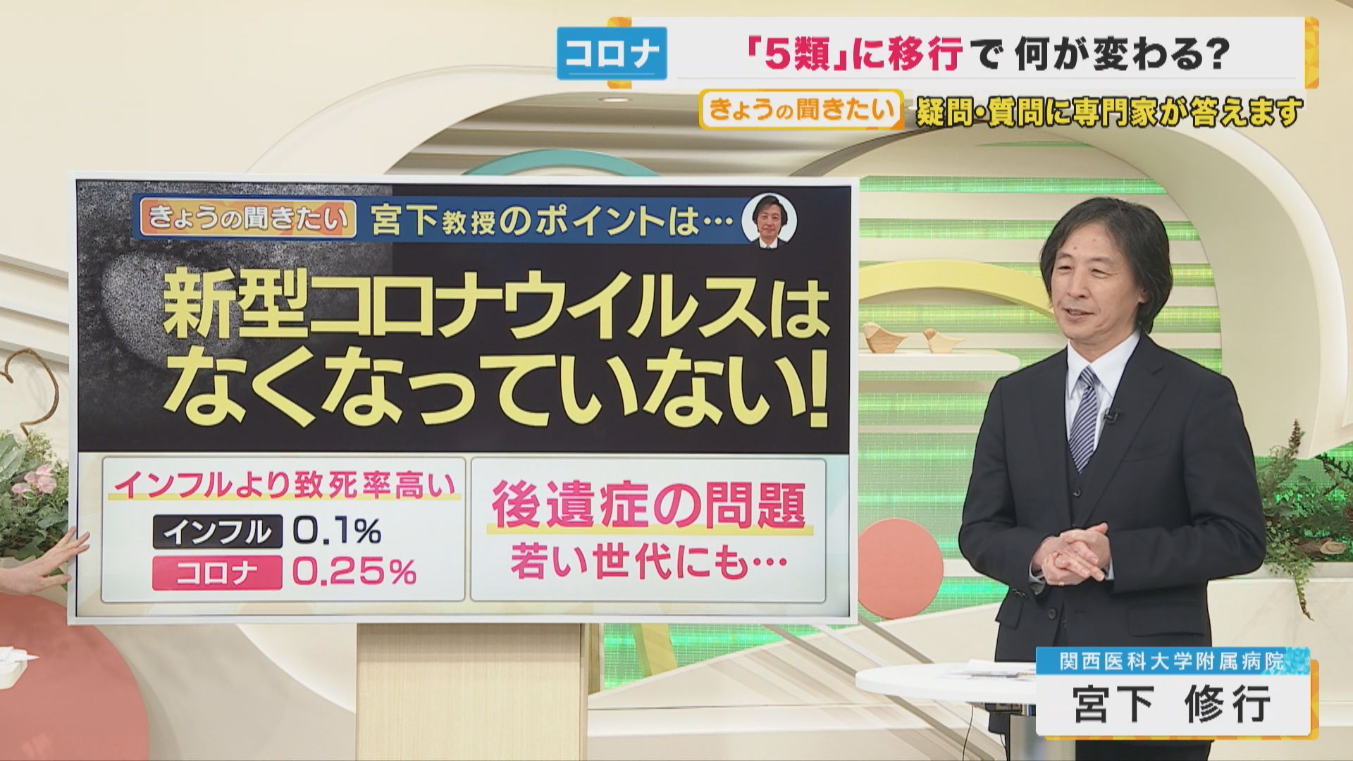 新型コロナウイルス感染症の法律上の位置づけが、8日から季節性インフルエンザと同じ「5類」に移行しました。医療機関などの対応が変わりました。今後の私たちの暮らしなどがどう変わるのか、感染症の専門家、関西医科大学附属病院の宮下修行教授に聞きました。