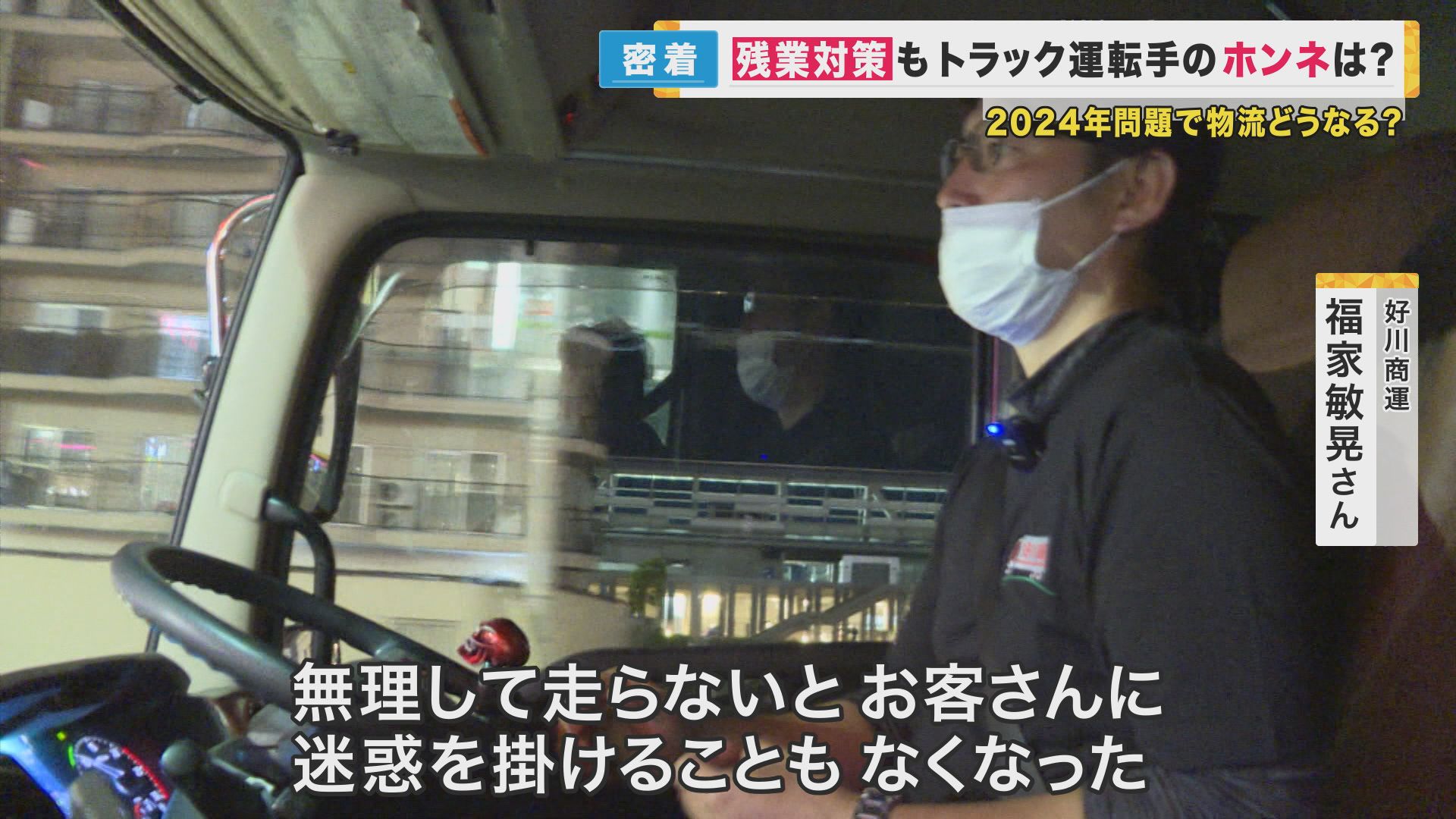 トレーラー運転手の福家敏晃さん。以前は、今よりも倍近い長時間にわたって働いていたそうです。しかし、2024年に向けて、福家さんの勤める会社は、残業時間を削減するため、さまざまな手を打っています。