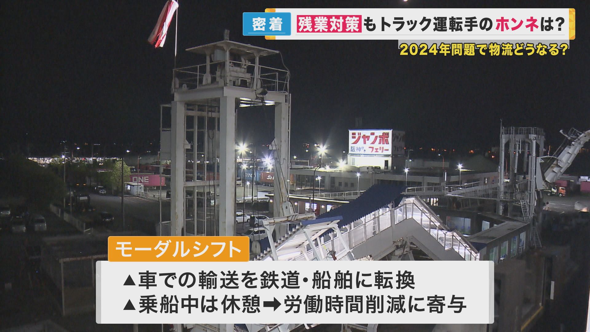 この日は、香川から関東方面へ冷凍食品を運ぶのですが、向かったのは高松港。福家さんの会社では6年前ほど前、四国と本州の行き来に船を活用する「モーダルシフト」を採用。「モーダルシフト」とは、車での輸送を、一部船舶や鉄道に転換することです。船で移動する間は、休息が取れるため、労働時間の削減に一役買っています。