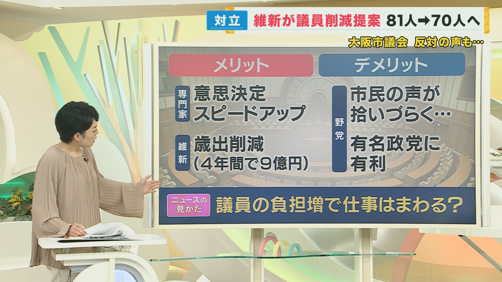 大阪市議会で過半数を持つ「大阪維新の会」が、議員を11人削減するという案を、16日に正式に承認しました。「身を切る改革」の一つですが、どんなメリット・デメリットがあるのでしょうか。