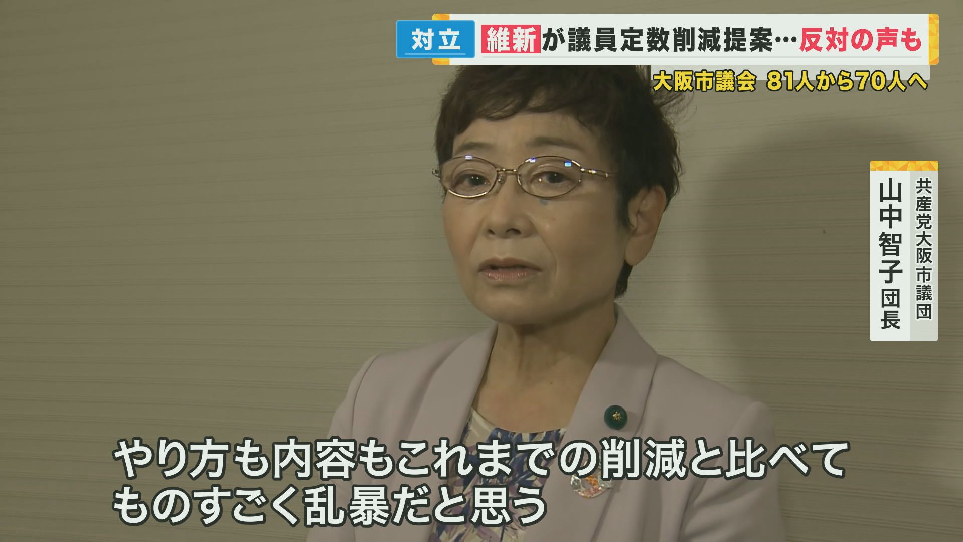 大阪市議会“過半数”「維新」が“81人→70人の削減案”を承認 各党の思いは 議員1人に対し市民3万9000人の状態に 公約は実現の一方「少数意見は届くのか」の声 2023年05月16日