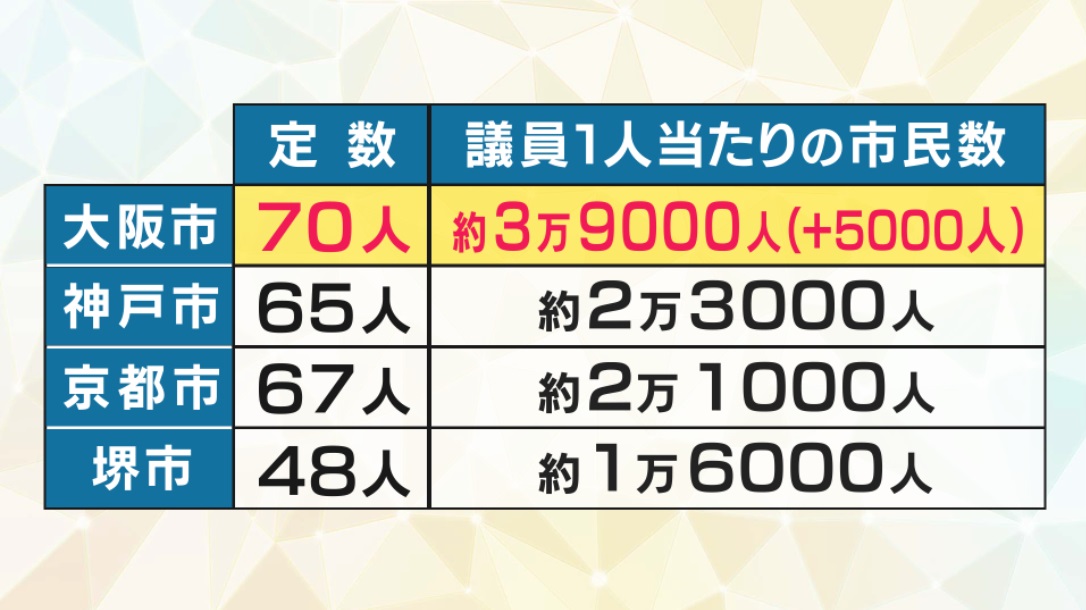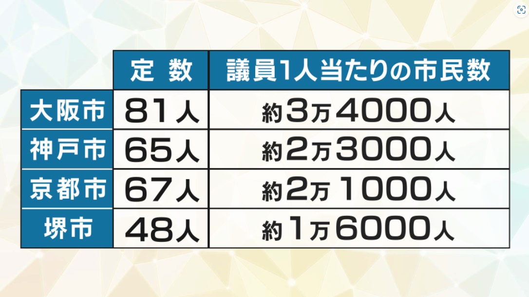 データで見ますと、現在の議員1人当たりにかかる市民の数、単純に計算すると大阪市の場合は1人の議員あたり3万4000人。他の関西の政令指定都市と比べて、すでに多くなっています。