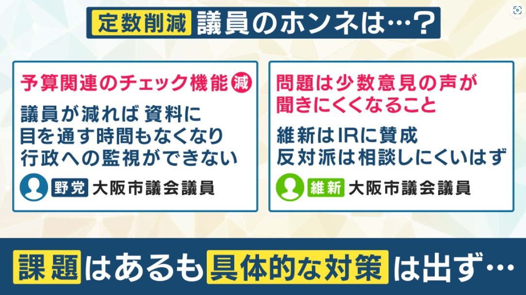 維新の議員の方から、『少数意見を聞きにくくなる』。例えば維新はIRに賛成ですけれども、 反対している人ってやっぱり相談しにくくなるんじゃないかなということを、維新の方も言っています。このような課題はありますが、具体的な解決策は出ていません。